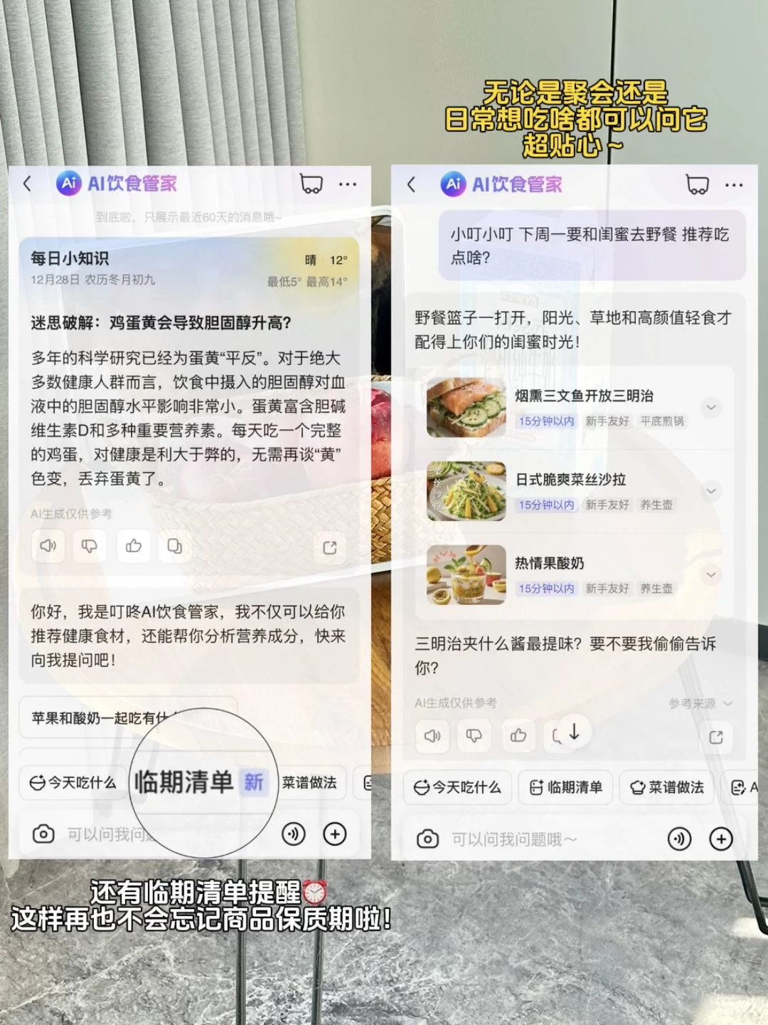 重点夸夸叮咚AI饮食管家,不仅帮我解决“吃什么”的选择困难,买完还会自动提醒牛奶和苹果的有效期,再也不怕食材放过期浪费,细节拉满!