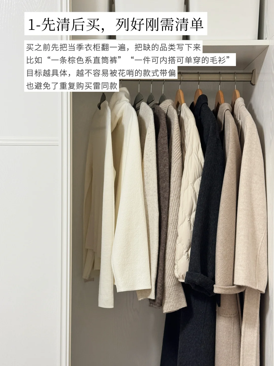 想买新衣服之前,先把当季衣柜翻一遍,把缺的品类写下来。比如“一条棕色系直筒裤” “一件可内搭可单穿的毛衫”,目标越具体,越不容易被花哨的款式带偏,也避免了重复购买类同款。