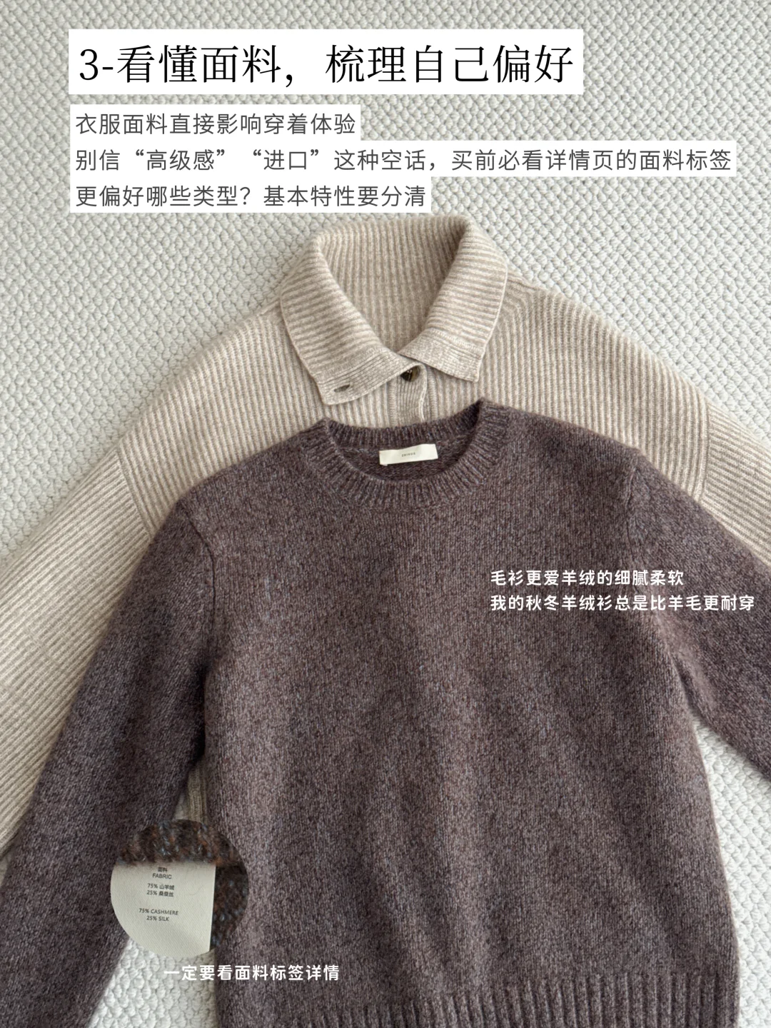 衣服面料直接影响穿着体验。别信“高级感” “软糯亲肤”这种空话,买前必看详情页的面料标签,基本特性要分清。T恤爱穿纯棉的,我的羊绒衫总是比羊毛更耐穿,外套会重点看保暖成份含量。