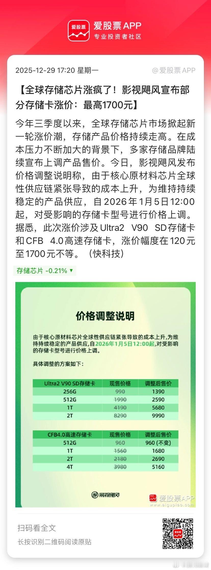【全球存储芯片涨疯了!影视飓风宣布部分存储卡涨价:最高1700元】今年三季度以来,全球存储芯片市场掀起新一轮涨价潮,存储产品价格持续走高。在成本压力不断加大的背景下,多家存储品牌陆续宣布上调产品售价。今日,影视飓风发布价格调整说明称,由于核心原材料芯片全球性供应链紧张导致的成本上升,为维持持续稳定的产品供应,自2026年1月5日12:00起,对受影响的存储卡型号进... 网页链接