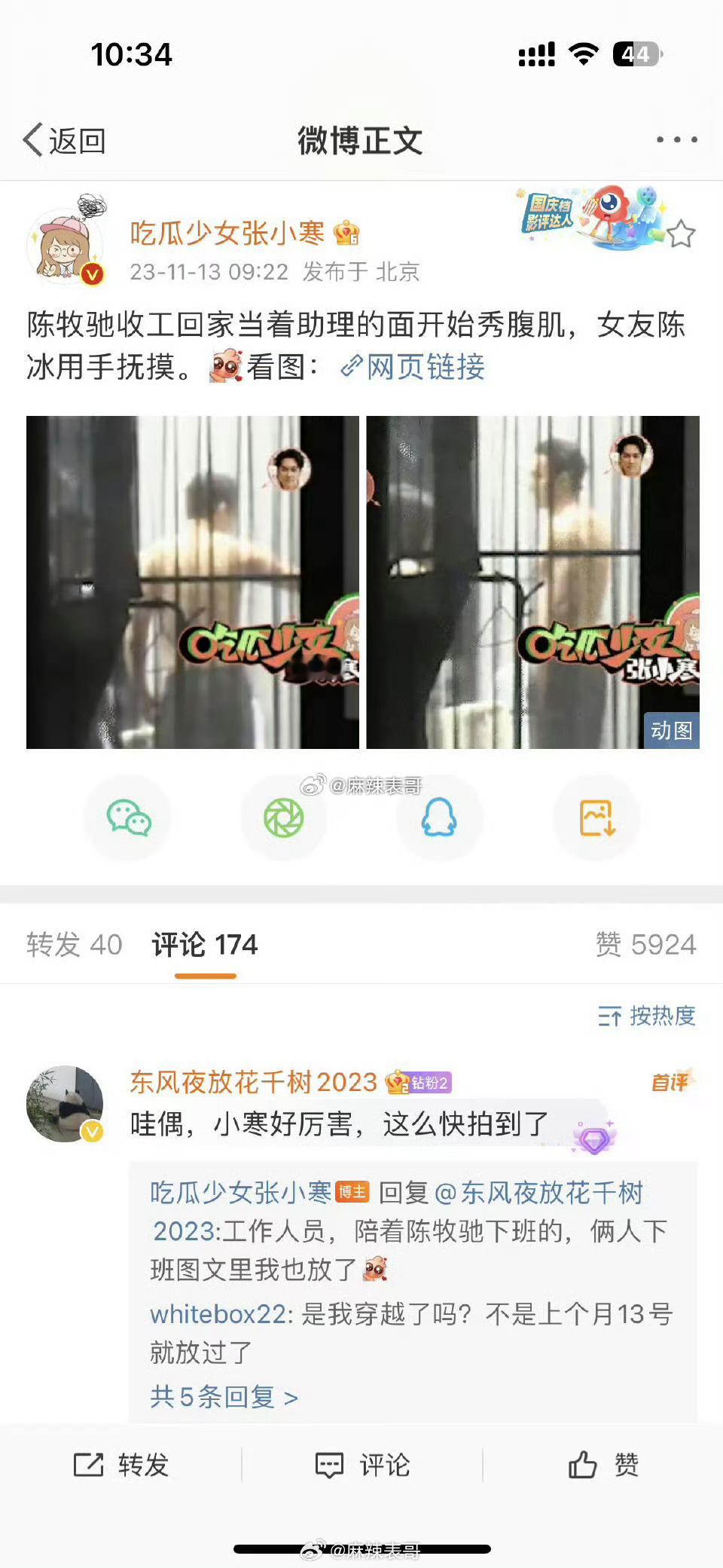 陈牧驰被拍到和陈冰餐厅约会,女方腹部隆起明显,疑似要做爸爸了。2023年,吴楚一出来锤陈牧驰,陈牧驰联系吴楚一要亲亲抱抱,吴楚一没有同意。陈牧驰粉丝去骂吴楚一,吴楚一随后又发了陈牧驰求他原谅的录音,陈牧驰说“我是一个君子,我一定会保全你”。后来粉丝在机场遇到陈牧驰,陈牧驰还哭红了眼睛。之后狗仔拍到了陈牧驰和陈冰当着助理的面秀腹肌亲亲抱抱。