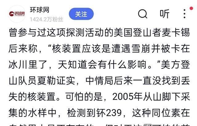 美媒爆料:为监听中国,美印曾在喜马拉雅山搞丢了一台核装置“为窃听中国,一台装满钚的核发电机在世界最高山峰之一神秘失踪,这是美国至今仍不愿提及的秘密行动……”《纽约时报》发表一篇长文,再次揭开了尘封半个多世纪的往事。 最近《纽约时报》发了一篇长报道,把60年前的一桩冷战旧事又翻了出来。1965年,美国中情局和印度情报部门合作,派出一支登山队去喜马拉雅山的楠达德维峰安装监听设备,目的是截获中国新疆核试验和导弹发射的信号。那时候中国刚在1964年试爆第一颗原子弹,美国急得不行,卫星拍不清,飞机飞进去又怕被打下来,就想出这个高山放置设备的点子。 设备核心是一台SNAP-19C型便携式核发电机,重约50磅,里面装了钚燃料,能长期供电,不用人守着。钚量不算小,大概相当于长崎原子弹里钚的三分之一左右,其中有钚-239和更多钚-238。登山队伪装成科学考察,背着天线、电缆和这台发电机往上爬。楠达德维峰海拔7800多米,地形凶险,登顶难度极高,队里既有美国专业登山者,也有印度经验丰富的队员。 快到顶的时候,突然来了一场大暴风雪,能见度几乎为零,风大到能把人吹下深渊。为了保命,指挥官下令撤退,把发电机固定在高处冰架上,打算第二年再来取。结果1966年春天回去一看,整个冰架都没了,只剩几根断绳。冬天雪崩把平台整个卷走,发电机连同钚燃料就这么消失在冰川里。此后几年,美国又组织几次搜寻,用辐射探测仪、望远镜、红外设备到处找,还动用直升机,但山里裂隙太多,冰川又在动,一点踪影都没找到。 这事一开始被严格保密,美国政府到现在都不愿正式承认。1978年才被媒体曝光,印度国内当时闹得挺大,民众抗议,议员质问政府怎么跟美国合作搞这种危险东西。楠达德维的冰川是恒河上游源头之一,恒河养活了好几亿人,大家担心钚泄漏污染水源。钚毒性很强,吸进去或吃进去可能致癌,半衰期还特别长。 后来美国和印度又在附近较低的山峰试过类似设备,有一套运行过几个月,确认了中国当时没远程核弹能力,但很快就出故障被回收。卫星技术发展后,这种山顶监听站就过时了。 60年过去了,这台发电机还在山里某个地方。专家说它自己会发热,可能融化周围冰雪,越沉越深。全球变暖冰川退缩快,有人担心它哪天暴露出来,要是外壳破损,放射物顺融水流下去,风险不小。还有一种担忧,万一被人捡到,钚能用来做脏弹,散布辐射污染。 印度这边,环保人士、地方官员和议员这些年多次要求美国给出交代,彻底搜寻回收。美国始终低调处理,没公开回应。2021年楠达德维附近山体崩塌引发洪水,死200多人,当时就有猜测跟发电机热量有关,不过科学家说主要是气候变化导致冰川不稳。 这事说白了,就是冷战时期大国为了情报不顾后果的典型。美国急于盯中国核进展,选了印度境内战略位置好的山峰,设备丢了却没负责到底。印度当年也配合,现在承担潜在风险。说到底,核材料这种东西,随便遗弃在水源地上,隐患留给后人,太不靠谱了。希望两国能正视问题,早点找办法解决,别让这冷战遗留物继续威胁下游那么多人的水安全。