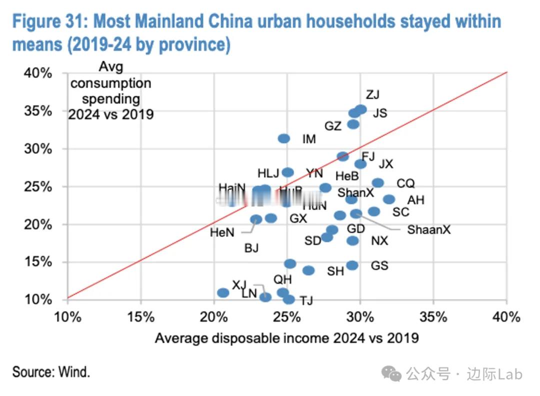 涵盖2019年至2024年的家庭收支数据显示,中国绝大多数省份的居民可支配收入增速超越消费支出增速,居民正普遍通过压降边际消费倾向来囤积现金,以应对未来的宏观波动。来源:摩根大通