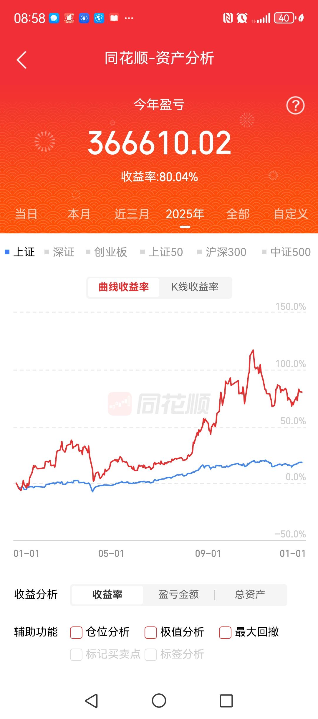 以下四张图,前三张是同一个账户三个不同时间段的收益展示。 第1张是2024年2月6号到2025年9月29号,收益将近750%。 第2张是2024年2月6号到今天,收益将近700%。 第3张是今年以来的收益,刚好80%。 第4章是目前的持股,基本上是各占半仓。 这些收益的取得,其实也就几个股票。2024年2月6号以来一直满仓持有的是沃尔核材,直到2024年10月23号卖掉。 之后买入半仓的600183生益科技和另外一个股票半仓。2025年1月22号卖掉生益科技,其中生益科技的涨幅大概是50%。然后买入002273水晶光电,直到今年10月卖掉水晶光电,出来的这部分资金又买了另外一个股票(占总体资金的半仓。),持有至今。 现在仓位满仓,两个股票各占半仓。 总结:2024年2月6号到现在,相当于三次满仓操作,其中第3次满仓操作,只是买入,至今还没有卖出。 截止今天,三次交易,收益将近700%!