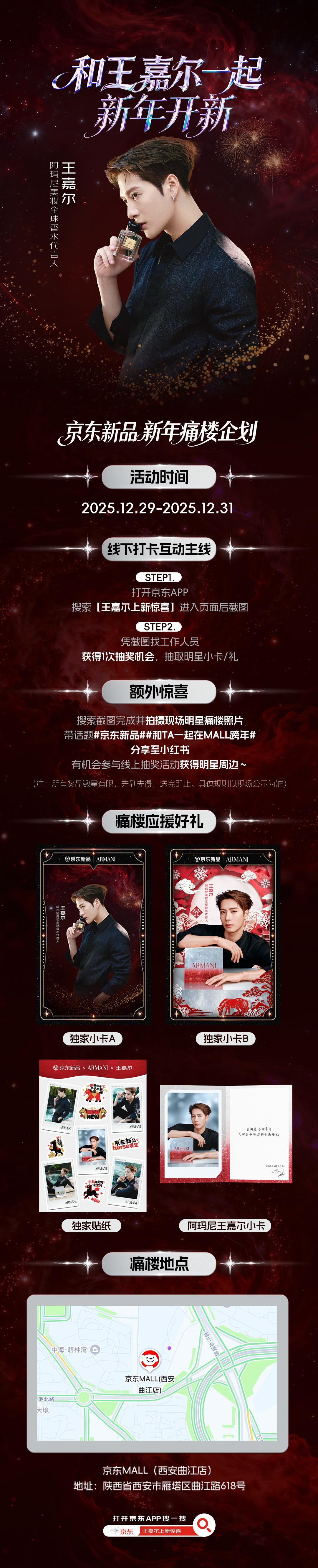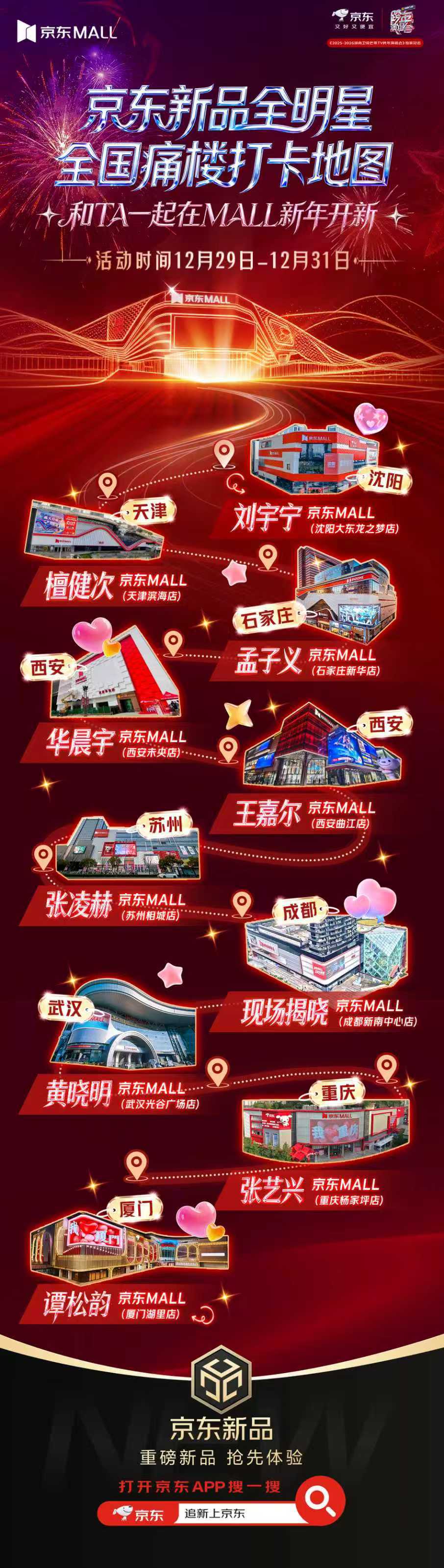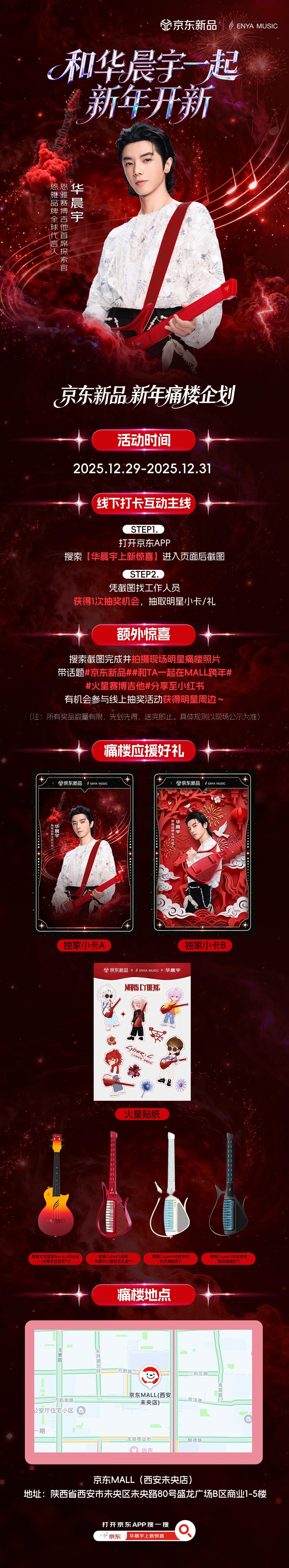 明星集结,跨年风暴来袭!12月29日-12月31日,京东新品联合全国京东MALL「明星痛楼」限时开启!陕西西安未央京东Mall和华晨宇一起跨年啦!现在去线下痛楼打开京东APP搜索【华晨宇上新惊喜】,和花花一起在MALL跨年,将有机会参与线上抽奖获得明星周边,痛楼应援好礼不仅有王嘉尔独家小卡,还有独家贴纸等你来拿!还等什么,快来京东MALL 网页链接 ,和你担一起点亮跨年之夜吧~ 京东新品 和TA一起在MALL跨年 全明星新愿派送