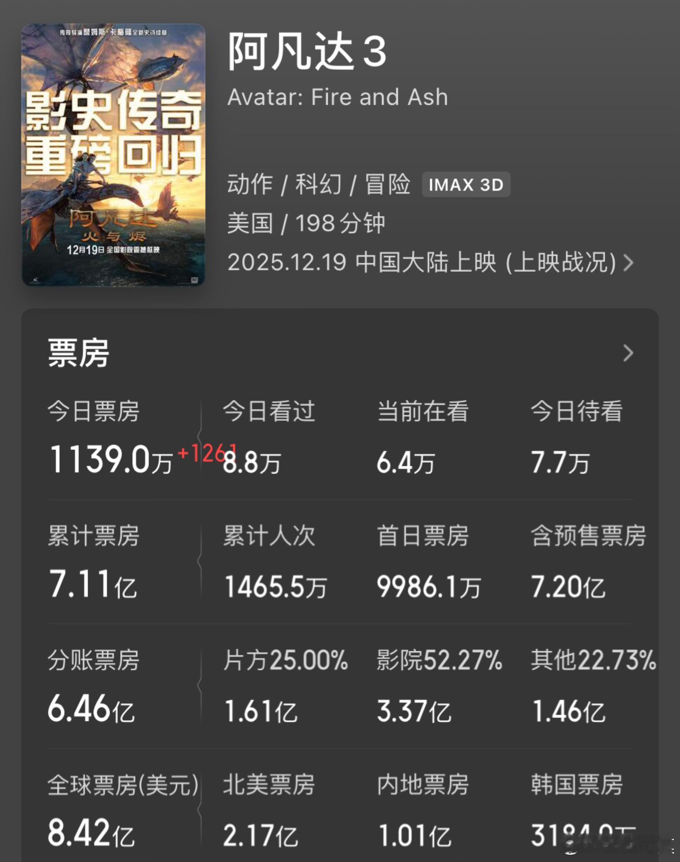 《阿凡达3》全球票房达8.42亿美元。内地票房也超过了1亿美元,是该片在海外的最大票仓。预计该片在后天也就是31号结束前全球票房能突破10亿美元。20亿刀还有可能吗?