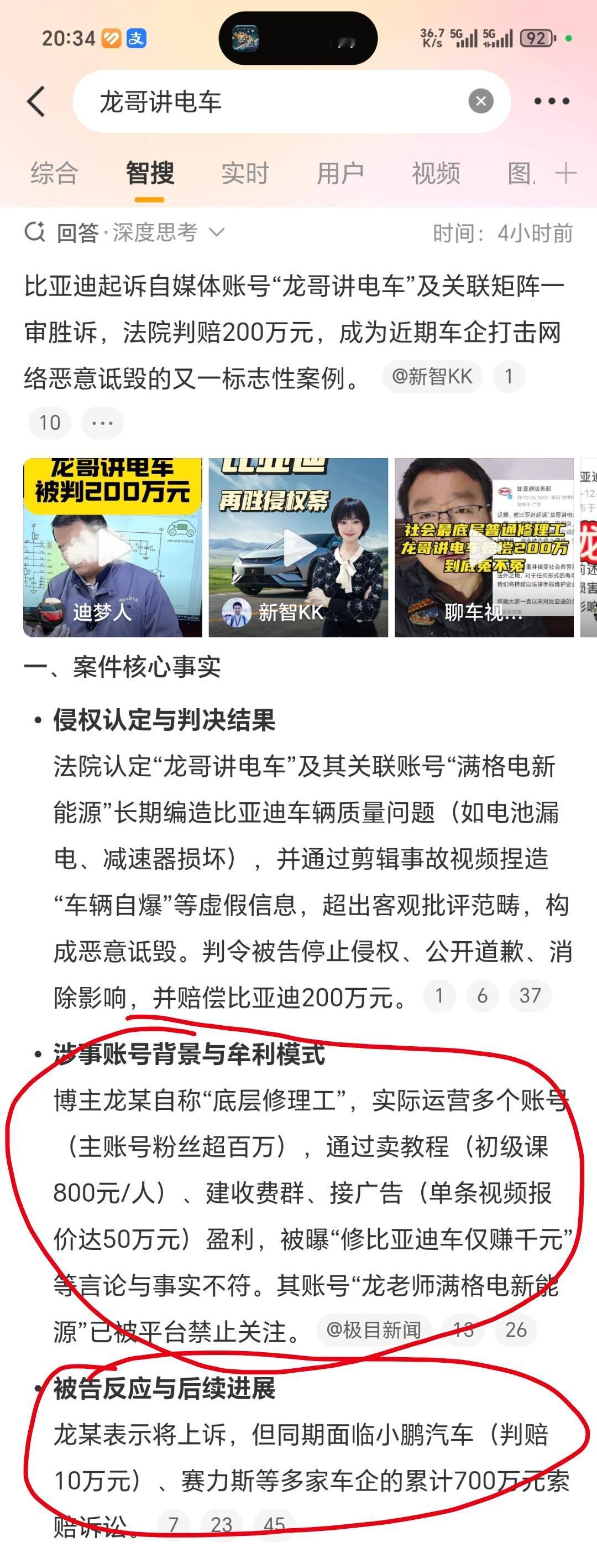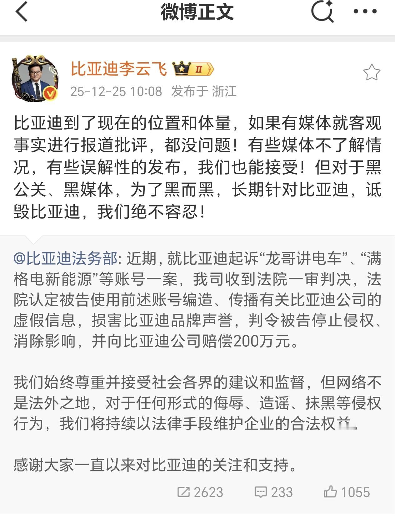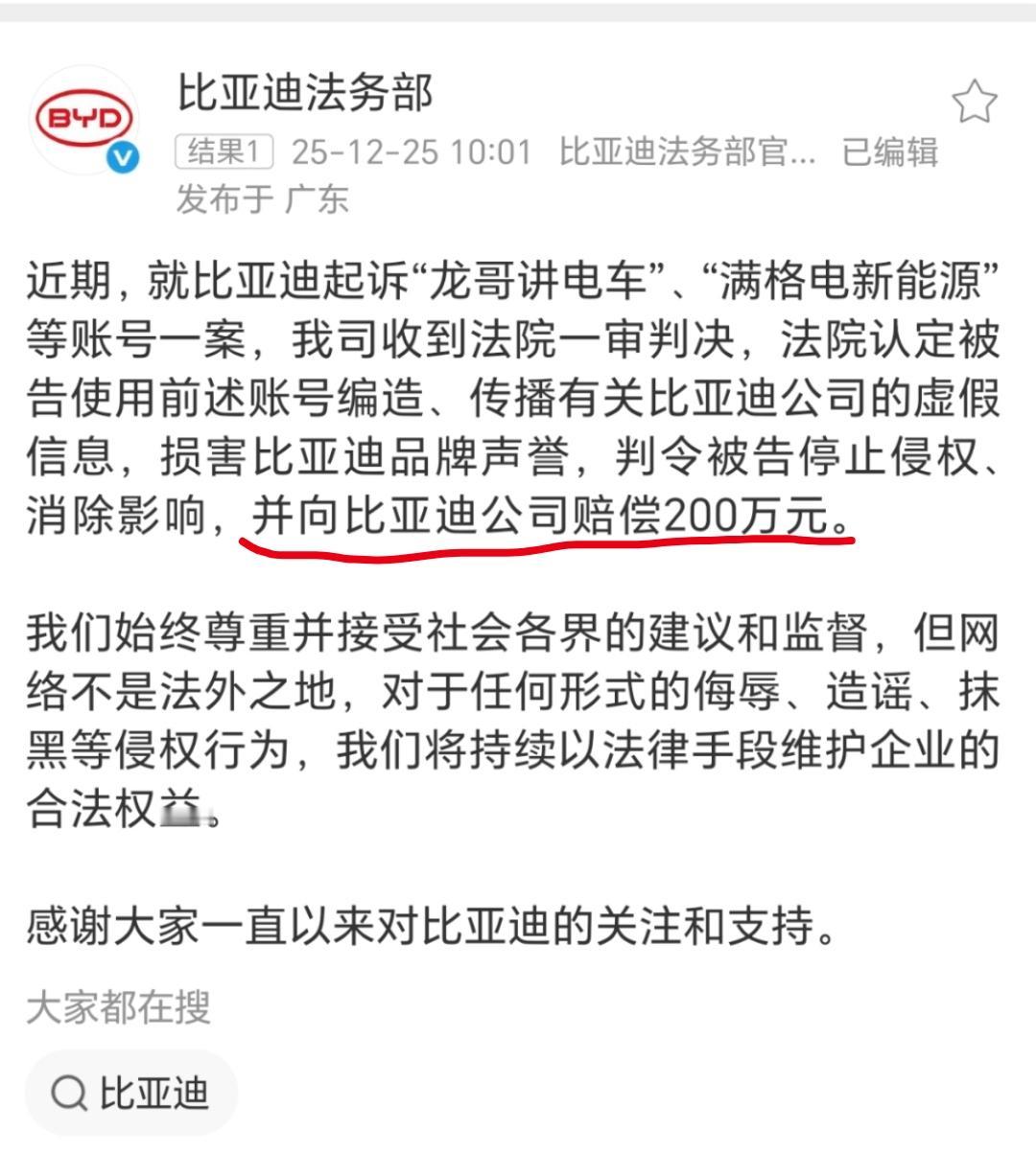 比亚迪成功起诉了一批博主,包括龙哥讲电车等,法院也实锤了,需要给比亚迪赔付200万元。[捂脸] 比亚迪李云飞说得已经很给面子了,可以批评,也可以误伤,但是知错犯错、为黑而黑,那就不好意思了,车企还是需要捍卫品牌正当权益的。 而且这几个账号也可能面临其他车企的索赔,蹲一波后续情况。