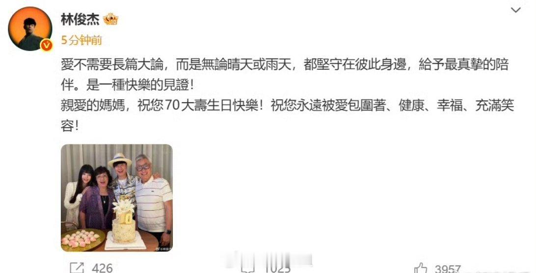 哇哦,林俊杰在给妈妈庆祝七十岁生日的时候,晒出来了一家四口的照片,正式官宣了自己的女朋友啊,祝福祝福啊