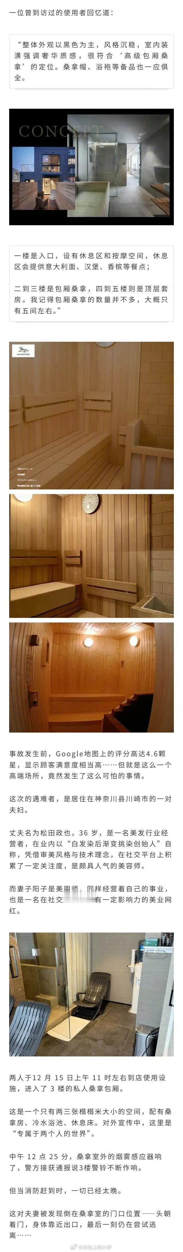 日本夫妇惨死桑拿房 12月15日,东京高端桑拿SAUNATIGER内,一对网红夫妇在70℃包厢内不幸身亡。本该守护安全的设施全成摆设。不符合行业规范的L形门把手脱落封门,两年未通电的紧急按钮沦为装饰,事发时三名工作人员竟全离岗。夫妇俩捶门至双手出血、用桑拿石划玻璃自救,最终仍倒在门边。这场悲剧撕开了高端服务业乱象。当商家只顾堆砌奢华体验,忽视基础安全,再高的评分、再优的质感,也不过是用生命为代价的危险噱头。安全底线不容失守,任何商业创新都不能凌驾于生命之上!生命有且只有一次