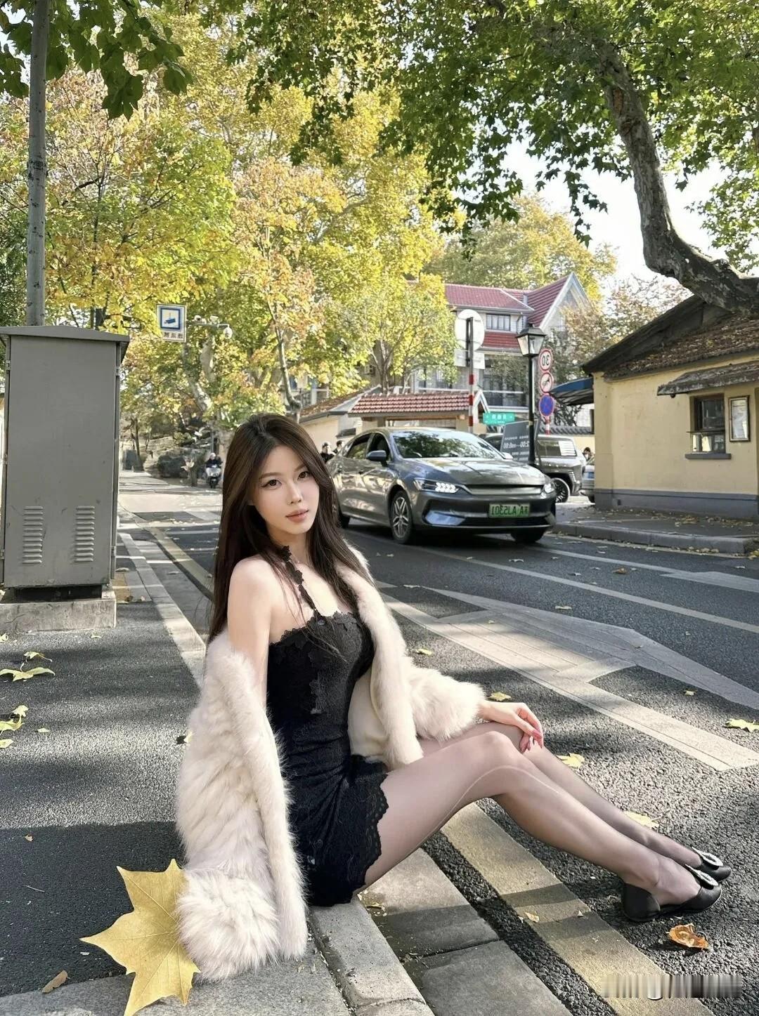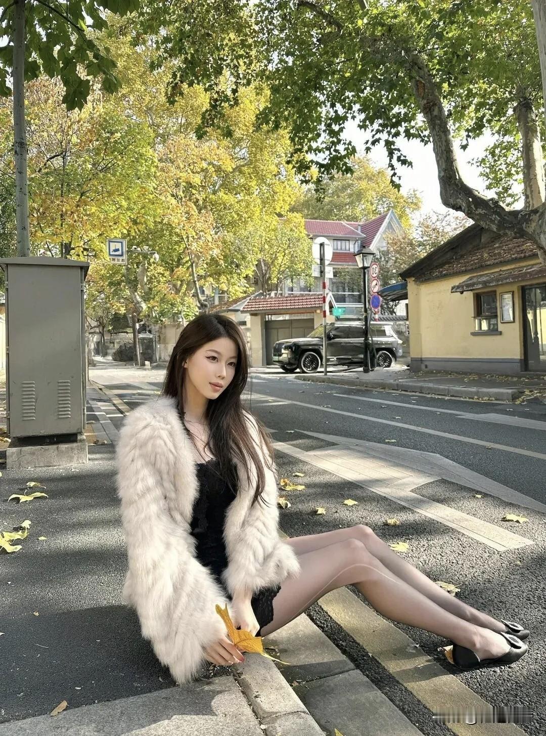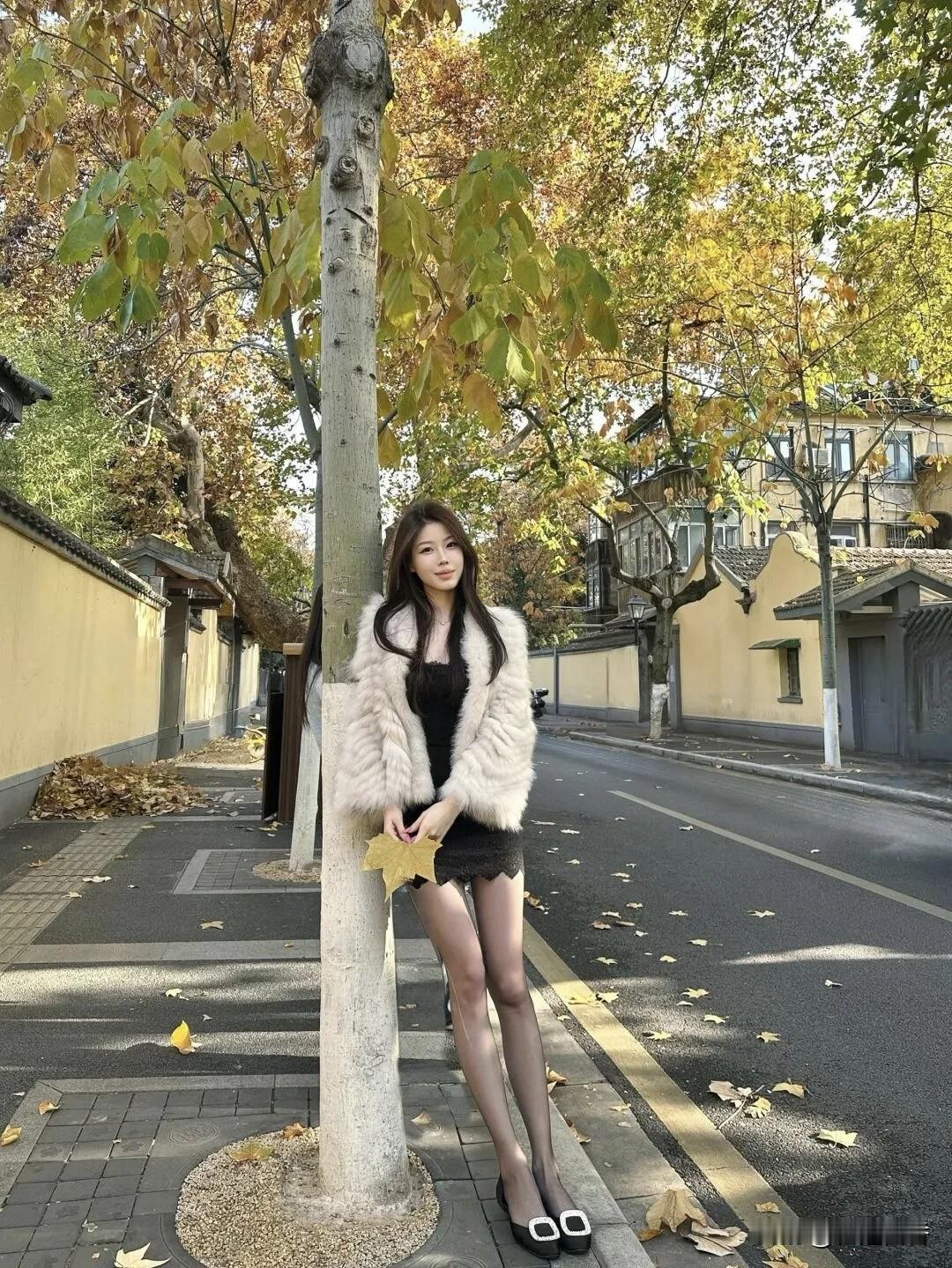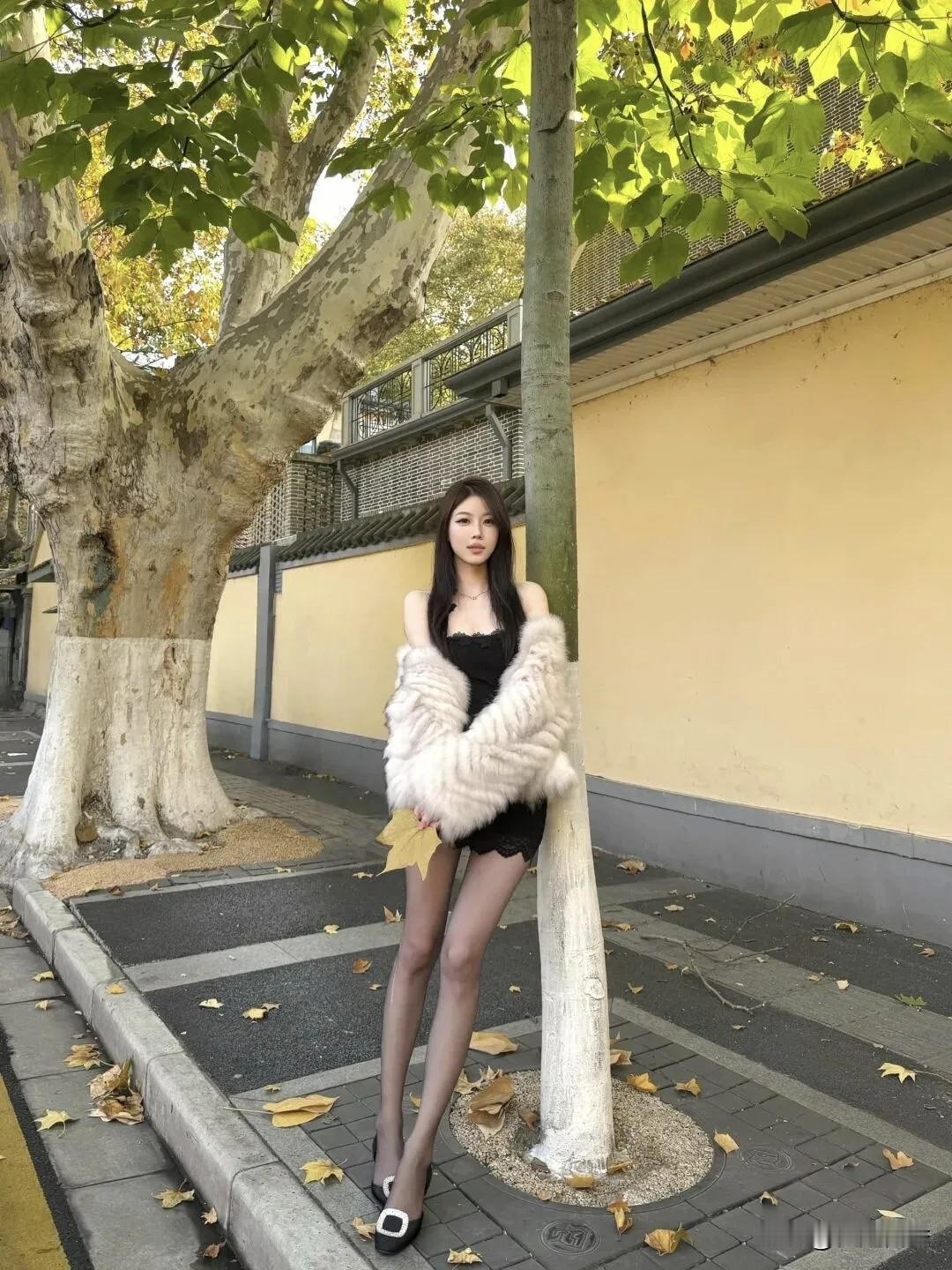 秋日街拍,落叶飘零,时尚少女与复古树影相映成趣。