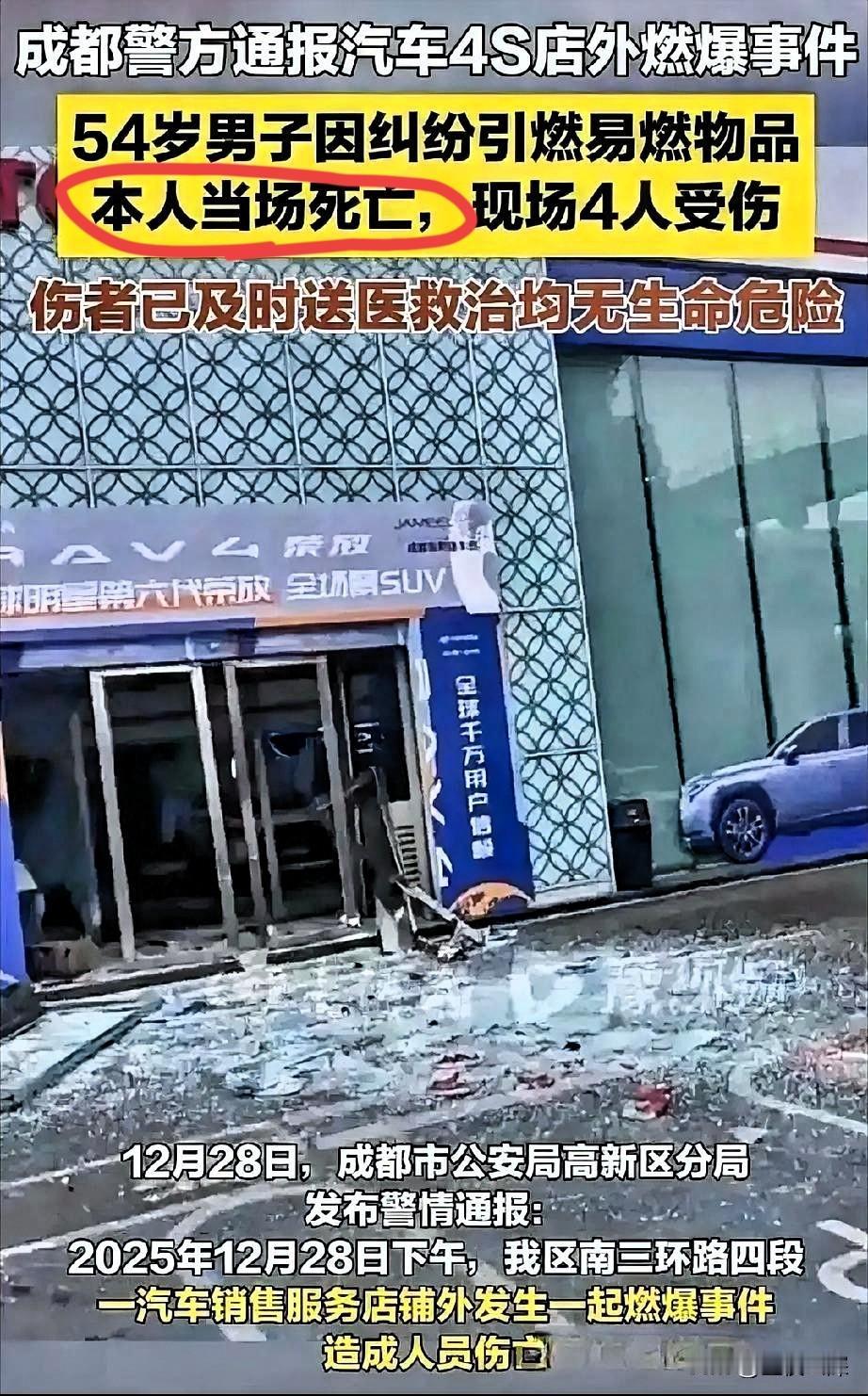 成都那一声巨响,打破了年底的平静。 54岁的男子身绑炸药冲进4S店,不仅结束了自己的生命,更导致4名无辜路人受伤。这已经不是简单的维权,性质早已变了味,演变成了一场无差别的报复社会。 看着现场满地的碎玻璃,除了震惊,更多的是心寒。无论此前遭遇了怎样的纠纷和不公,选择这种极端方式,不仅无法解决问题,反而让原本可能占理的诉求变成了犯罪。 最让人心痛的是那4名路人。他们只是恰好路过,原本只是想过个好年,却无端卷入灾难,甚至可能面临身体和家庭的重创。 一个人绝望到极点,可能会选择毁灭自己,但绝不该拉无辜的人垫背。这一炸,毁掉的不仅仅是现场的几个人,更是背后好几个家庭的天。 为了争一口气,搭上性命,背负骂名,还伤害了更多无辜的人。这笔账,怎么算都是满盘皆输。成年人解决问题的方式,绝不该是这种失去理智的疯狂。