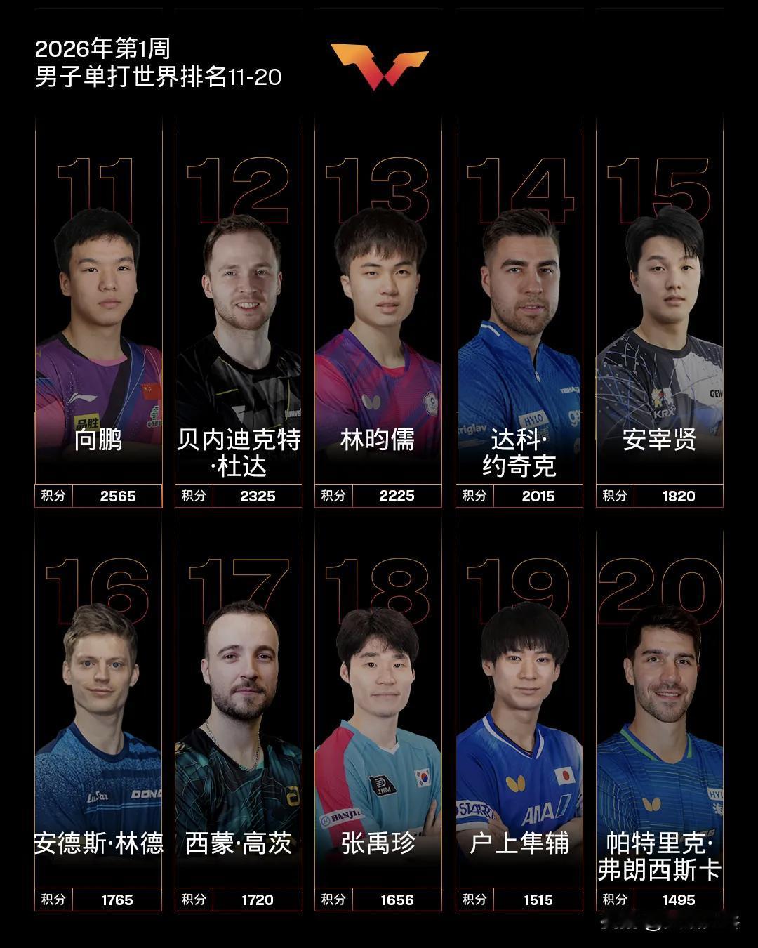 国际乒联2026年第1周世界排名 【来源:ITTF】 男子单打,中国队球员王楚