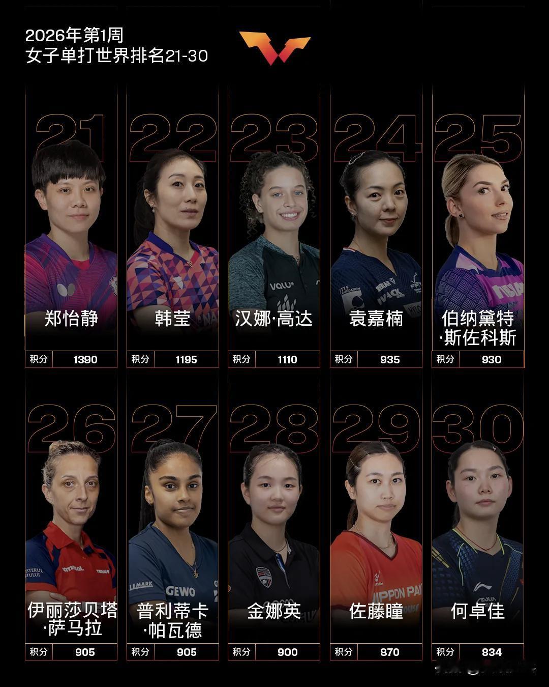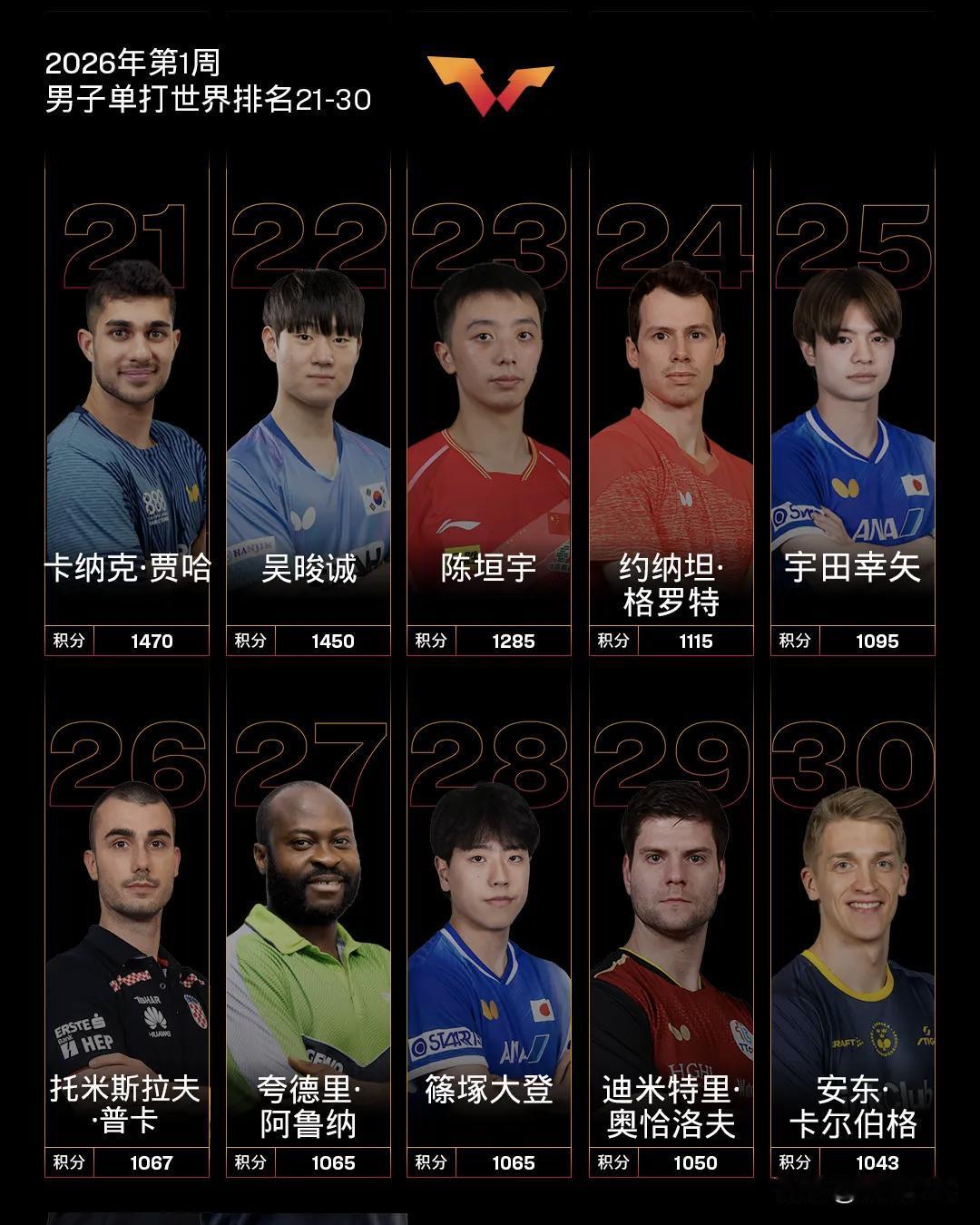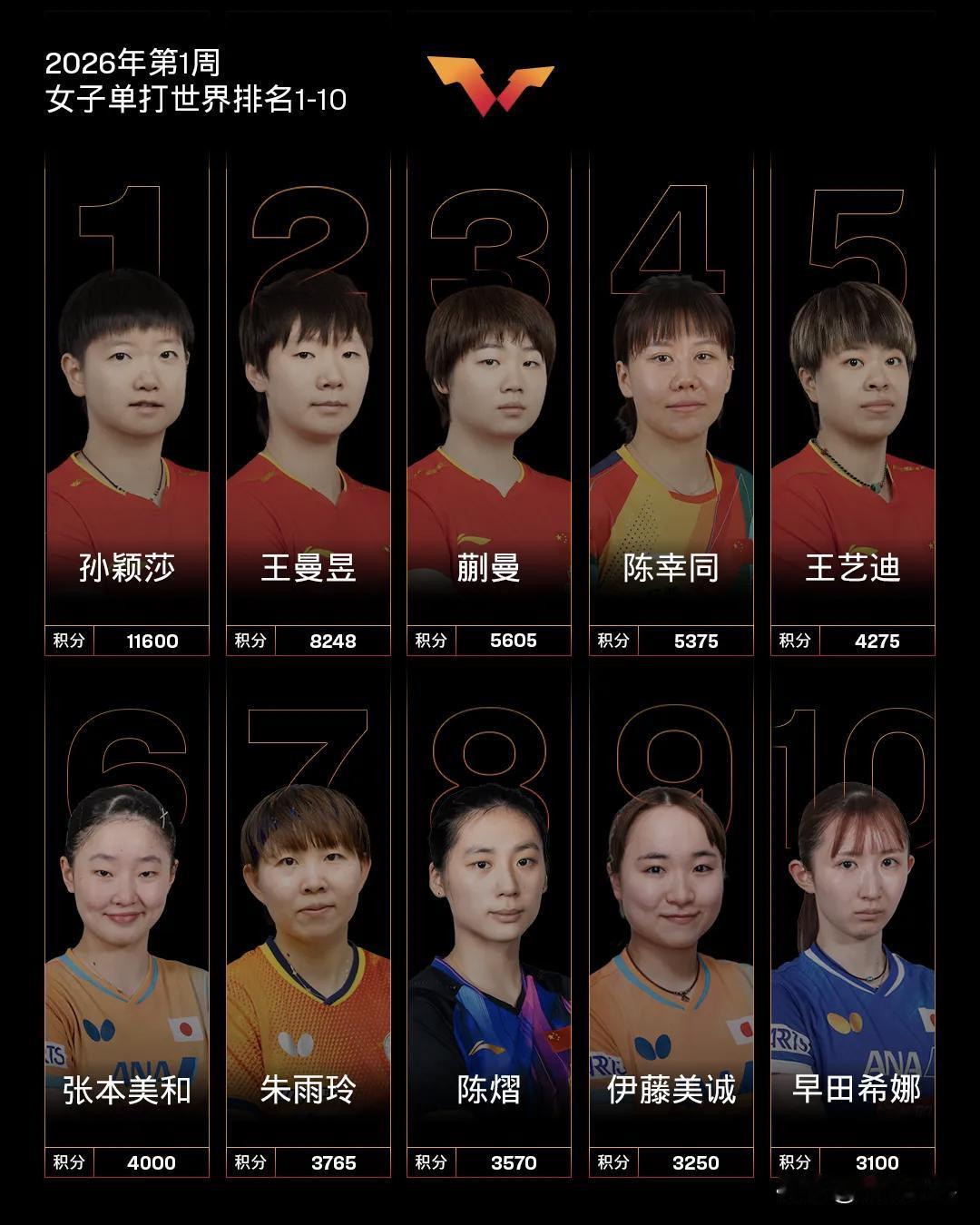 国际乒联2026年第1周世界排名 【来源:ITTF】 男子单打,中国队球员王楚钦、林诗栋位列前二,梁靖崑位列第七。 户上隼辅排名上升1个名次位列第19;帕特里克·弗朗西斯卡排名上升1个名次位列第20;托米斯拉夫·普卡排名上升1个名次位列第26,刷新个人职业生涯排名新高;弗拉芬·科顿排名上升1个名次位列第32,刷新个人职业生涯排名新高;曼纳弗·维卡诗·塔卡排名上升1个名次位列第34,刷新个人职业生涯排名新高;陈俊菘排名上升1个名次位列第44,刷新个人职业生涯排名新高;约瑟夫·阿卜杜拉齐兹排名上升1个名次位列第47,刷新个人职业生涯排名新高。 其他中国队球员,向鹏排名第11,陈垣宇排名第23,周启豪排名第40,黄友政排名第48。 女子单打,中国队球员孙颖莎、王曼昱、蒯曼、陈幸同、王艺迪位列前五,陈熠位列第八。 其他中国队球员,石洵瑶排名第13,何卓佳排名第30,覃予萱排名第34,钱天一排名第38。 2025.12.29