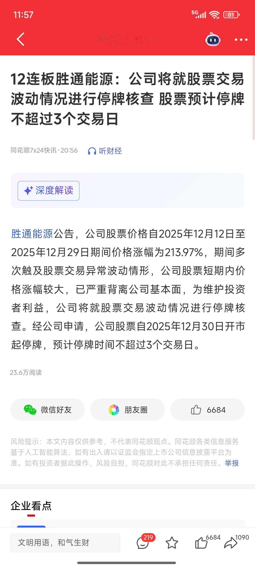 持有胜通能源的散户可以提前放假了 公司公告,停牌核查预计不超过3个交易日 节前还有两个交易日 所以复牌肯定是节后的事情了 目前胜通能源连续12个涨停板 停牌核查是在预期之内的事 不能用利好和利空解读 全仓的股友安心过节吧 过完节继续吃大肉 真让人羡慕嫉妒恨呀