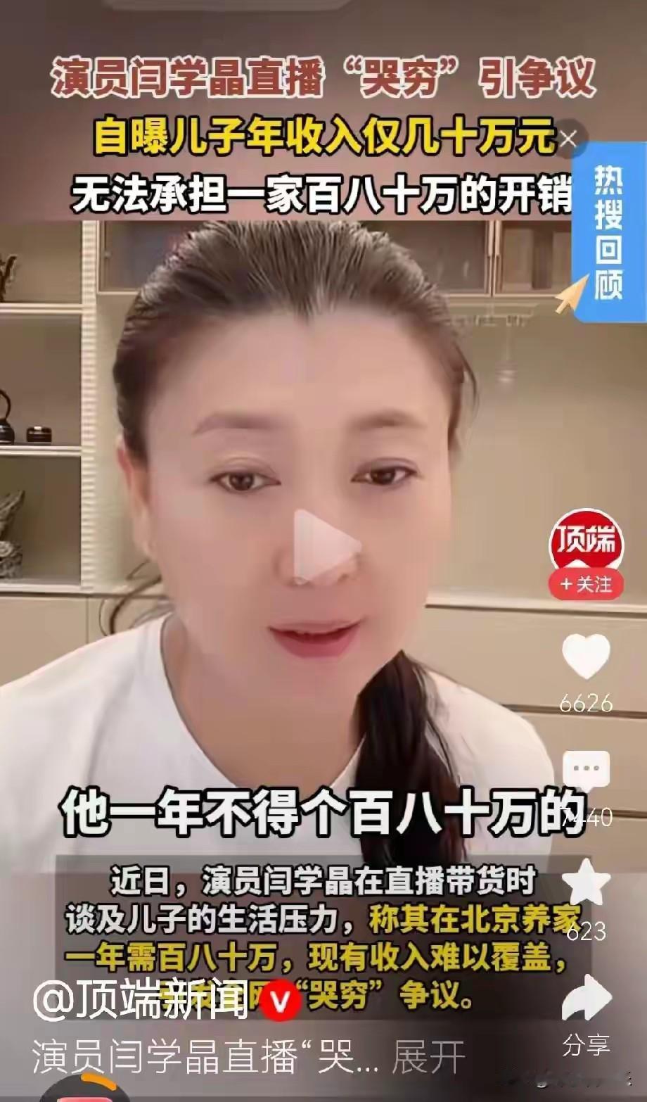 近日,老戏骨闫学晶在直播中透露,32岁的儿子林傲霏已结婚生子,但年收入仅几十万元,难以负担家庭年开支八十万至百万元,否则家庭无法正常运转。这一言论迅速引发网友热议,舆论焦点集中在“明星家庭收入与普通人的认知差距”以及“星二代生存压力”等话题上。闫学晶在直播中表示,儿子林傲霏作为演员,一年最多接一部戏,片酬仅几十万元;儿媳是音乐剧演员,年收入不足十万元。两人合计年收入不足40万元,但家庭在北京的年开支却高达八十万至百万元,包括房贷、育儿、教育、保姆费用及社交应酬等。她直言:“儿子如果在电视剧行业坚守会很难,压力非常大,另一个出路就是跑横店闯一闯。”