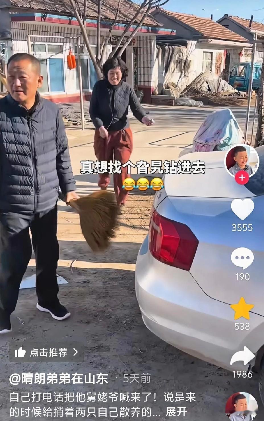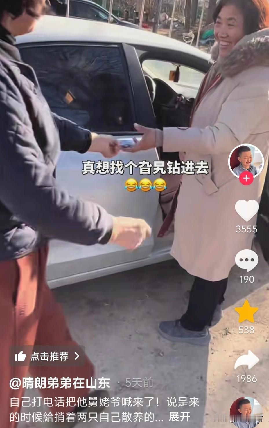 近日,山东,一名女子正在厨房做饭,听到儿子在客厅打电话说:“舅姥爷,我想你了,来的时候能捎两只你散养的老公鸡吗?” 女子赶忙出来,儿子已经挂了电话。半个小时后,舅舅舅妈就开着车把鸡送来了。聊了一会儿,舅舅舅妈没吃午饭就走了。 临走时,舅舅说早替你们打算好了,明年的麦子给你们送几袋蒸馒头吃。舅妈说后备箱还有两把自己手工制作的把笤帚,也留给你们扫地用吧! 女子自嘲表示,这些鸡是舅舅舅妈好不容易一把粮食一把米喂大的,平时恐怕连自己都不舍得吃,结果儿子三言两语老公俩就开车把鸡送来了,真替妗子不值,摊上我们这一家厚脸皮的亲戚。 看完视频,女子别往心里去啊,这哪是“厚脸皮”,分明是舅姥爷和舅妗子打心眼里疼你们、把你们当自家人。 他们拎着鸡、说要送麦子、捎带笤帚疙瘩,这些都是最实在的心意——自己舍不得吃的鸡、亲手做的笤帚,都是把最好的东西往这儿搬,压根儿没想着要啥回报。反倒是女子的这份“过意不去”,才是真的把他们的好放在了心上。 其实这种亲戚间的热乎劲儿,就是你推我、我让你藏着的亲近,女子要是实在过意不去,回头买点他们爱吃的东西送过去,或者常去串串门唠唠嗑,他们比啥都高兴。(来源:晴朗弟弟在山东)