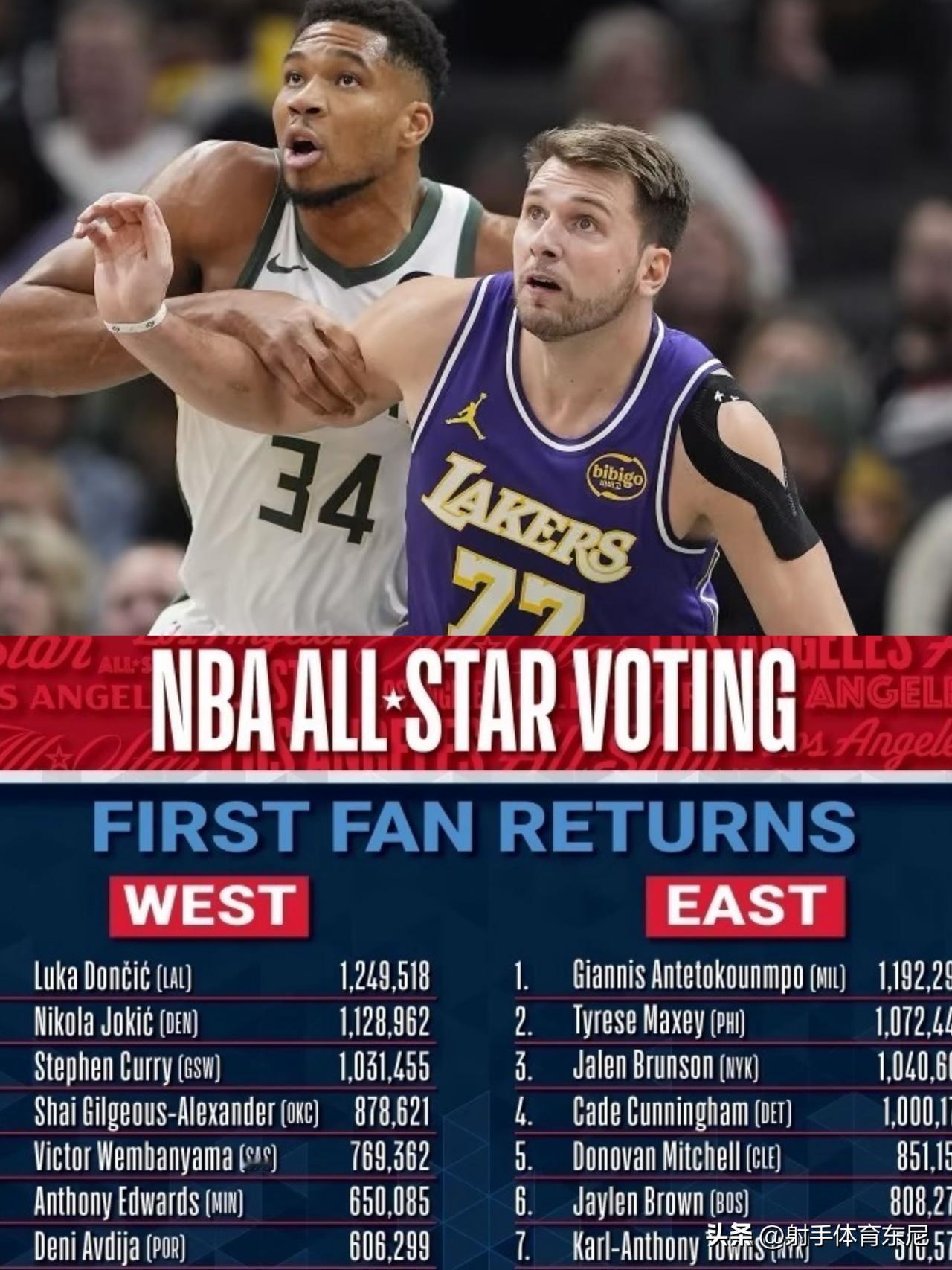 NBA官网公布全明星票选首轮结果,字母哥、东契奇分别当选东、西部票王![爱慕][