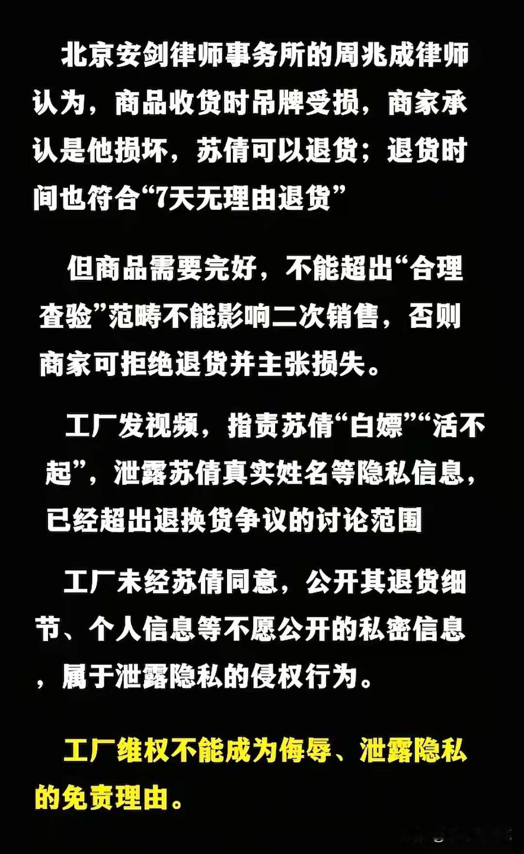一件633元的羽绒服,冲上了热搜,搅动了网络,当事三方都成了输家! 12月14日,三亚女孩苏某某收到了网购的羽绒服,发现吊牌绳子打着结,就询问商家这衣服是不是别人退的货,现在是二次销售,得到了商家否定的回答,说吊牌绳是打包时不小心弄断的,衣服保证全新!12月17日,苏女士带着羽绒服登上飞机到哈尔滨旅行。12月24日,苏倩返回三亚后申请了退货退款,理由是衣服二次销售! 商家同意了退货要求,但厂家不干了,他们收到的羽绒服袖口和领口都有污渍,口袋里还有一张登机牌,明显就是穿过好多天的。但苏女士只是承认从机场到酒店的时候穿过一次衣服,双方没达成一致,厂家将登机牌信息发到了网上,忽然一下子就全网传开了,后面的传播议论情况太快太广,他们已经无法控制! 现在三方都在叫屈! 苏女士认为,个人隐私被泄露,厂家不地道,欲追究法律责任!厂家感觉衣服有污渍,影响二次销售,发的视频被举报下架,已经传开的现在也无法撤回!商家认为自己只是个中间人,但店铺被封被处罚,自己太冤了! 这究竟是谁的错?[笑哭][笑哭][笑哭]