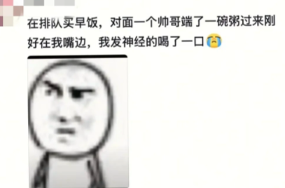 在排队买早饭,对面一个帅哥端了一碗粥过来刚好在我嘴边,我发神经的喝了一口