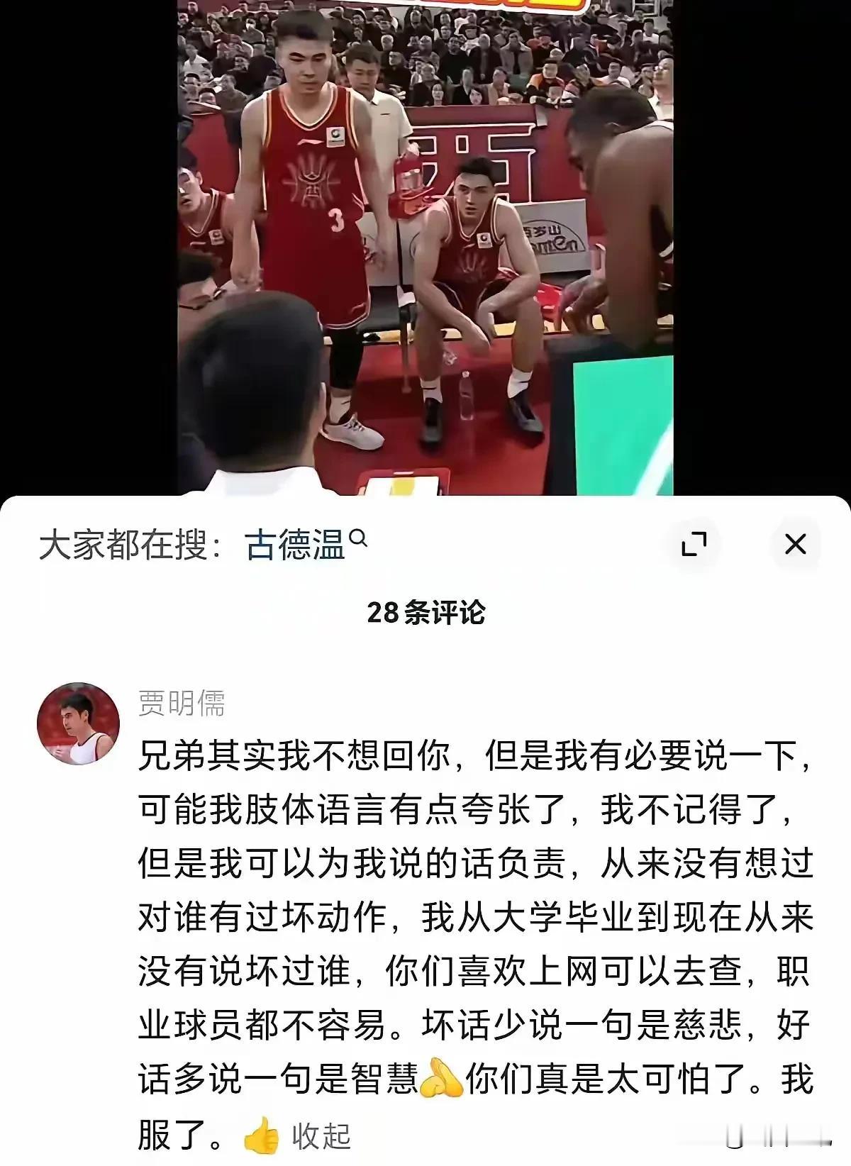 贾明儒对造谣惑众的博主直接举报! 很多球迷困惑于南边的球迷掌握着舆论主导权,好像他们说红就是红,说黑就是黑。感叹于自家的舆论声音低、替自己主队伸张正义的少。面对抹黑者的恶意剪辑,误导引战,山西汾酒男篮球员贾明儒勇敢地说不,用法律手段抵制造谣惑众者,直接对造谣惑众账号举报。下方截图,说的是山西与广东男篮比赛叫停阶段,贾明儒在与队友交流防守技战术,被南边的球迷抹黑为贾明儒给迪亚洛示范如何用肘伤害对方的动作,导致球迷恶意解读。这种低级的做法,被贾明儒描述为:生活不容易,全靠网上骂人来了,你看他这长的像好人吗?