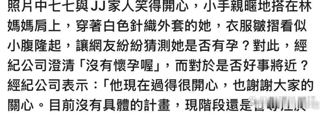林俊杰方否认女友怀孕林俊杰经纪公司回应称:“没有怀孕。”并表示林俊杰现在过得很开心,也谢谢大家的关心。“目前没有具体的计划,现阶段还是会专注于生活与工作。