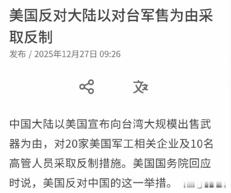 美国提出抗议! 当美国宣布要和台湾当局签订军售大单之后,中国对美涉及企业及高管实行制裁,这本是“有来有往”的对等博弈,美国却不爽了,声言反对中国以对台军售为由实行反制。 只准州官放火不许百姓点灯,美国的霸道做派着实让人啼笑皆非。你们可以公然侵犯一个国家的主权,却不允许这个国家抗议反制,这是什么强盗逻辑?! 不怪乎有的舆论指出,中国的反制还是烈度不够,还有些许的克制,没有直击美国的痛处,如果中国直接卡住美国的咽喉,让他们大喘气去! 舆论进而建议,不妨按照美国的招数去招呼他们,派出军警实施海上拦截,或是要求所有进入台湾的船舶先到大陆指定港口进行检查,确保没有军火输入到岛内。现在中国有这个实力,只要下定决心,不怕掀桌子,看看美国有没有底气、敢不敢闯关。