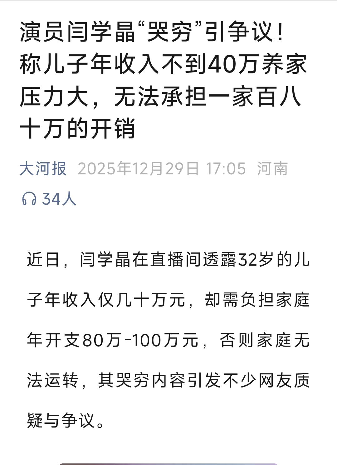 虽然在明星领域,她儿子的工资确实不高,但是:1、谁知道她这个话有多少水分在?2、这已经比普通工薪族不知道要高出多少了。3、不高不是有你这个明星妈呢吗,你多拍点乡土剧,帮衬着点,不比在这儿哭穷来的实际吗?4、别是给儿子到时候直播带货预热呢吧?5、一年80-100万的基本开支,不行你就劝你儿子少花点,或者把供不起的房子卖一卖。