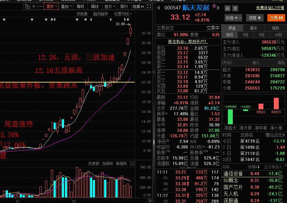 兄弟们注意了!商业航天龙头航天发展,中国卫星要砸盘出货了!商业航天总龙头航天发展五浪加速,这股是商业航天最高标,之前卡异动,现在JG放松,无论是趋势高标,连板高标都彻底放飞。 不停牌就是利好就持续拉升,盛通能源更是一口气拉出12个涨停,今天才停牌。 今天主力净卖出超11亿,但股价依旧大涨冲涨停,这说明主力边拉升边出货;不仅是航天发展,中国卫星今天大涨冲涨停,冲5板,趋势加速,主力净卖出9亿。 主力大卖,股价大涨。 一方面说明主力拉高出货,边拉边卖;另一方面是散户追高接盘,因为没有散户会相信自己会接最后一棒,都知道是击鼓传花,但始终认为别人会接自己的一棒。 按照主力操盘的逻辑,出货完成之后,就不会维持价格,就会走跳水。 也就这一两天,趋势死于加速。