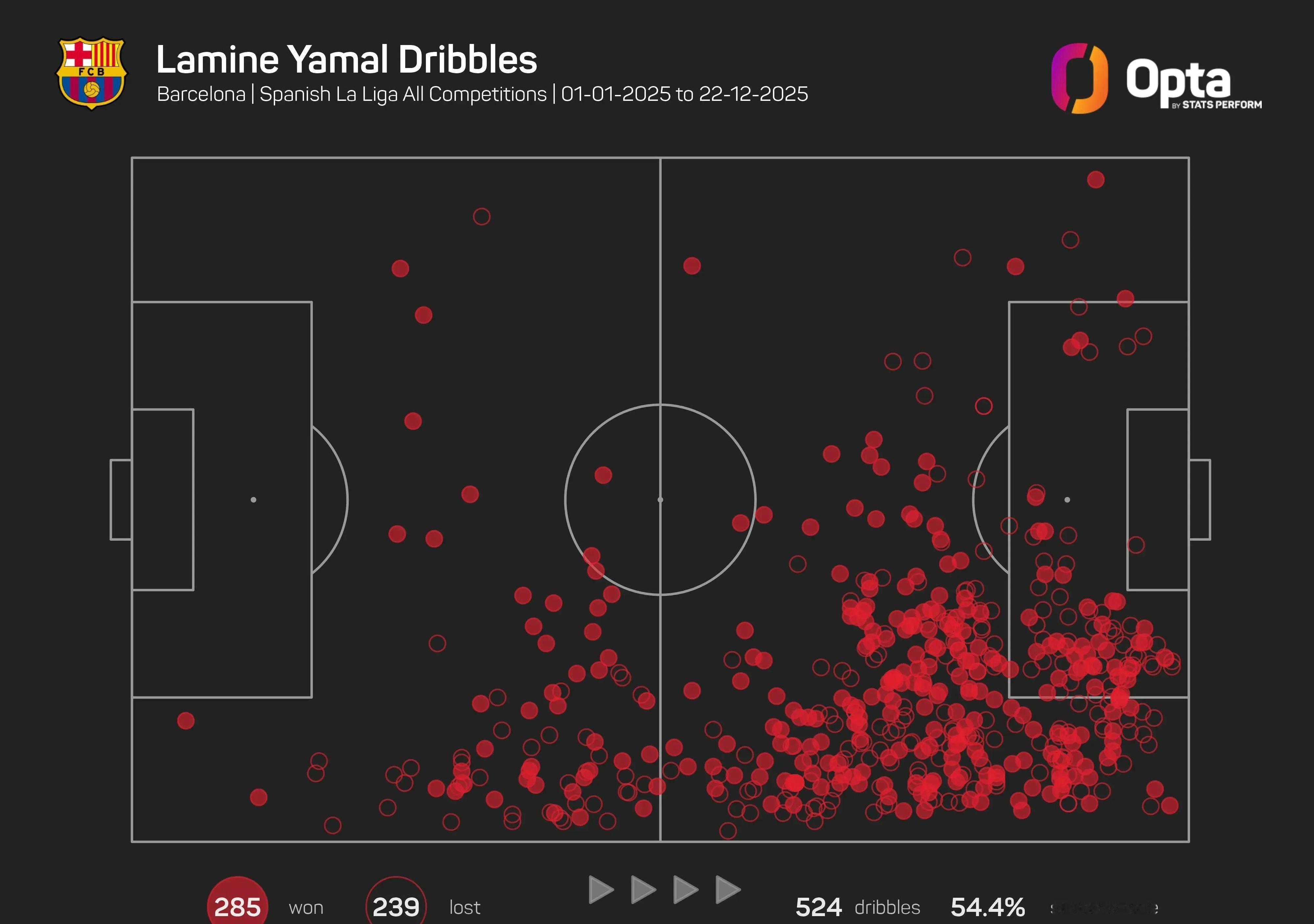 2025年度过人王:亚马尔今年亚马尔尝试524次过人,成功285次,五大联赛最多,成功率达到54.4%。亚马尔的杀手锏是45度内切过人接射门,但如果没有大量的下底突破,没有大量对防守的迷惑和变化,像很多逆足边锋那样只会内切,是做不到这种成就的。可能有人觉得,54%的过人成功率不高,但是梅西那样动不动60%成功率场均过6次的人,这辈子也没有几个,亚马尔才18岁,这已经是凡人世界顶级的过人数据了。巴萨亚马尔