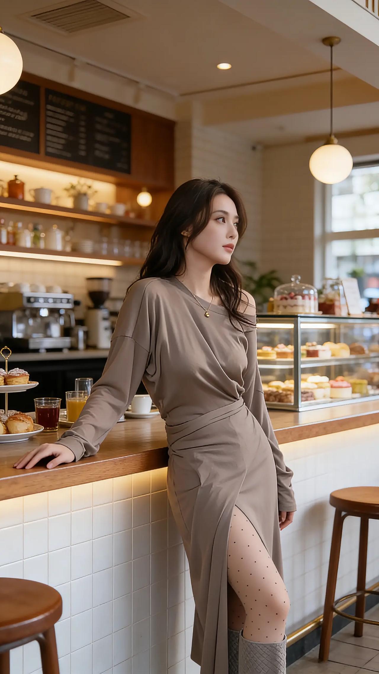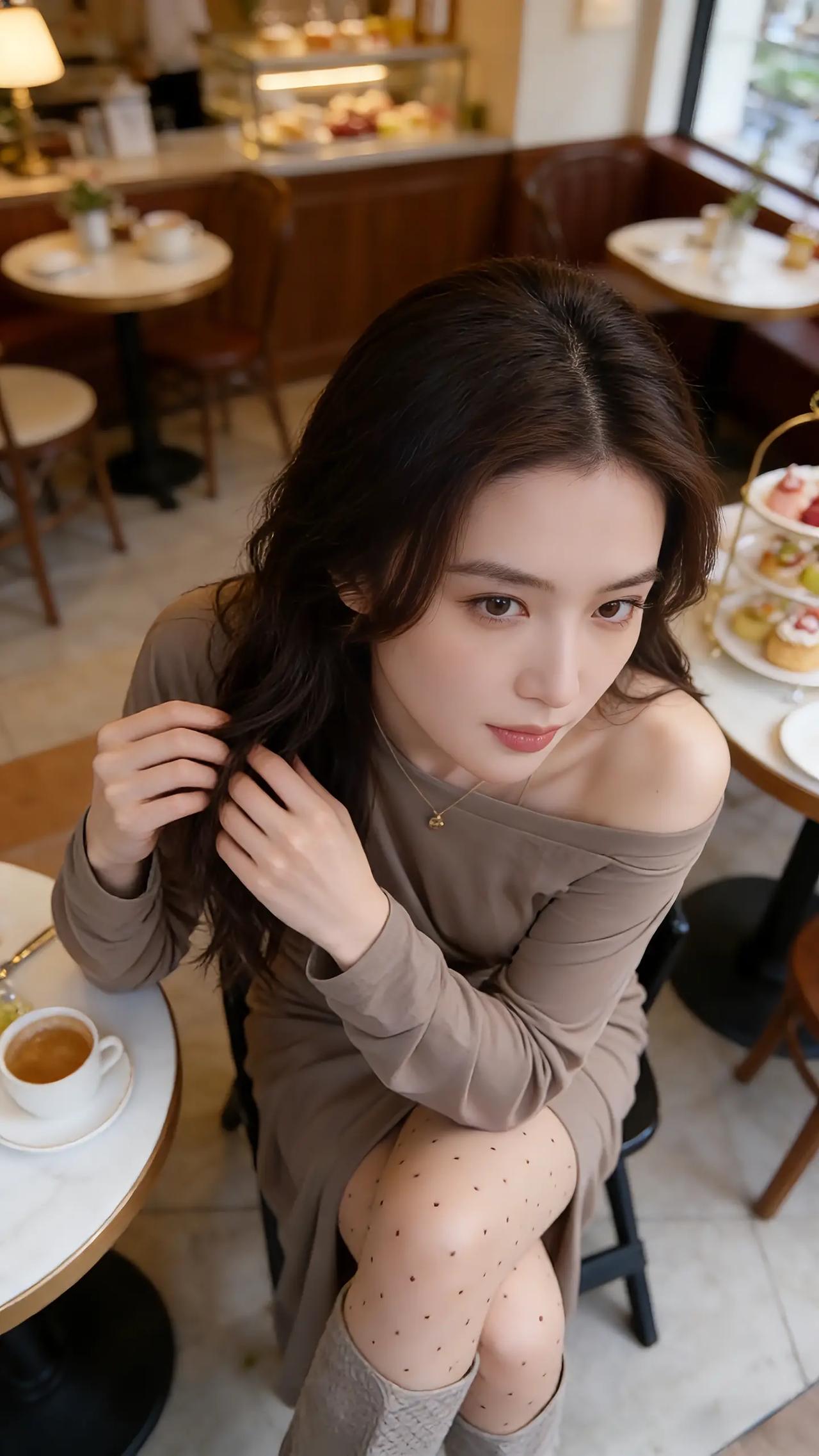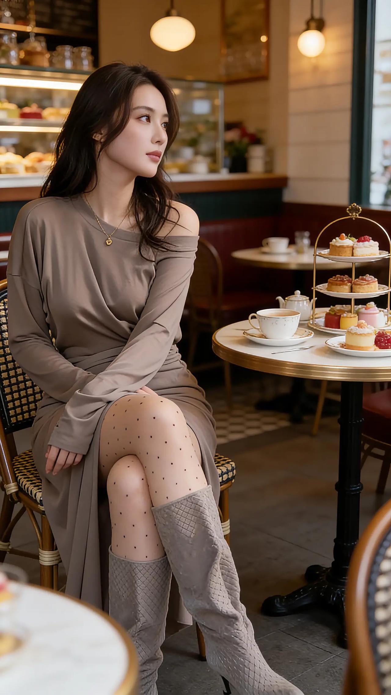 咖啡馆里,优雅少女沉思,甜点诱人,氛围温馨。