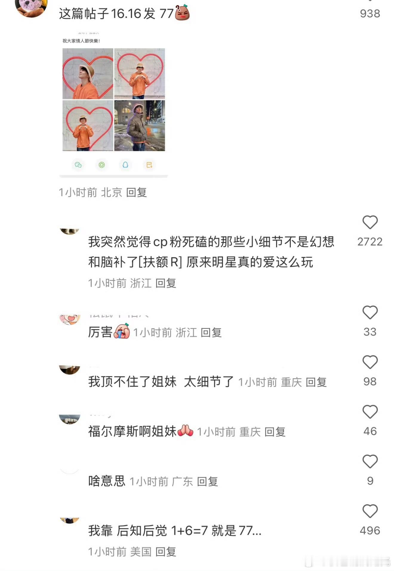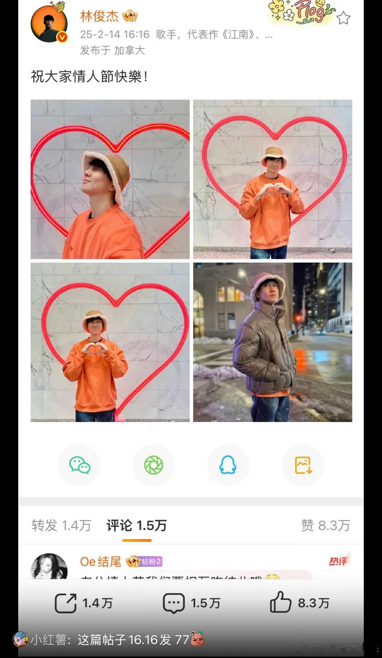 林俊杰情人节发博时间 网友发现林俊杰今年情人节发博时间是16点16分,1+6=7,也就是说发博时间是77,而林俊杰女友又叫77,这是什么细节糖啊!