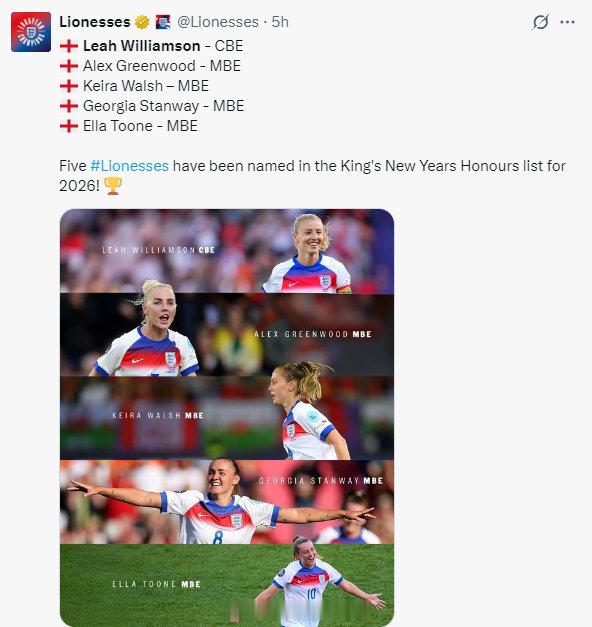 《卫报》透露,英格兰新年授勋名单正式公布,带领英格兰女足成功卫冕欧洲杯冠军的主教练魏格曼被授予荣誉女爵士头衔。在具体的授勋名单中,英格兰女足队长莉亚·威廉姆森被授予大英官佐勋章勋章,亚历克西娅·格林伍德、乔治亚·斯坦威、埃拉·图恩和凯拉·沃尔什则获得大英员佐勋章勋章。体坛其他知名人士如热刺前主席列维也在榜单之列。文化大臣丽莎·南迪盛赞这对于女子体育而言是“历史性的一年”,魏格曼与英足总也纷纷表达了对这份荣誉的感激与自豪 英超联赛 阿森纳著名教授
