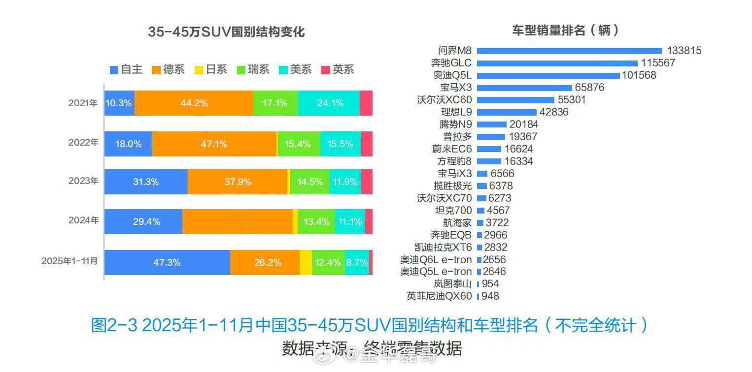 刚看完年度报告,今年40万级SUV市场真的变天了。问界M8干翻BBA不是靠性价比,而是靠“体验定价权”——用户现在愿意为“不累的长途”和“无缝的生态”花40万。最让我惊讶的是纯电版占比40%,这说明什么?问界M8销量火爆背后的原因 就是精准拿捏了“用电是偏好,智能是刚需”的新消费共识。中国大型SUV市场年度报告