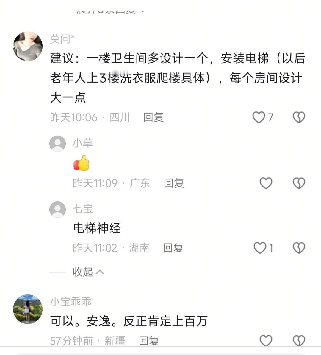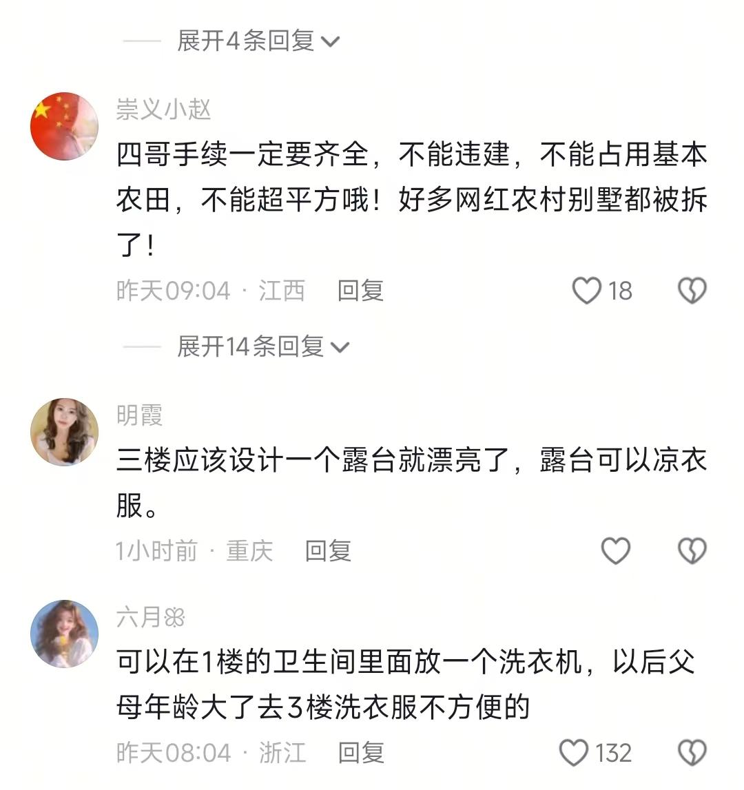 现在全网最后悔的男人就是农村四哥了吧! 不是因为要建新房了,也不是因为用了二千八做了个设计图出来,而是因为拍视频给网友看后,直接炸了评论区 你敢相信吗?昨天刷到农村四哥晒别墅设计图的视频,本来想当个轻松瓜吃,结果点进评论区直接绷不住了!有人喊他小心违建被拆,有人算着200万才能盖成,还有人硬要他改洗衣机位置,说不然就是不孝顺。说实话,我本来以为就是个普通的农村建房分享,咋越看越闹心?这哪儿是晒设计图啊,分明是把私人生活架到火上烤,你们有没有过这种感觉?刷个日常视频都能刷出辩论赛的窒息感,郁闷! 先跟你们捋捋事儿:农村四哥在老家筹备盖三层别墅,花2800元请人画了三个月设计图,分层规划得挺清楚,本来想直接定版,结果瞅着一楼厕所位置又犹豫了,想改改。然后喊来老爸和徒弟王丰、梁快来看,几个人都挺认可。就这么个简单的事儿,一晒出来直接炸了锅,评论区的观点能分成三拨,吵得稀里哗啦。 第一拨网友全在算钱,说建这别墅至少200万,还感慨“网红是真挣钱啊,个个都盖别墅买好车”。我晕,我之前认识个做农村自建房的表哥,去年帮邻村盖了栋3层毛坯房,连工带料才花了48万,就算加上装修,撑死也就百万出头。网友张口就200万,这是把网红的钱当大风刮来的?本来想跟评论区抬个杠,后来发现不少人都这么说,合着大家对网红收入的刻板印象这么深? 说真的,这让我想起之前刷到的一个事儿:有个美食网红晒自家厨房改造,网友估摸着要20万,结果人家实际花了5万,评论区立马有人说“装穷”。你说这荒谬不荒谬?网红挣钱是可能比普通人容易点,但也不是每个网红都能随便掏出200万盖房吧?吗喽的命也是命,网红的钱也不是天上掉的锦鲤啊! 第二拨网友还算靠谱,提醒四哥“手续要齐全,别违建、别占基本农田,好多网红别墅都被拆了”。这点我觉得挺给力,毕竟之前贵州有个农户没批先建,新房被拆老屋还是危房,最后啥赔偿都没有,这教训确实得记着。但第三拨网友的操作就有点让人看不懂了,非要让四哥把三楼的洗衣机挪到一楼,说“爸妈老了爬楼不方便”。 不是吧?人家四哥自己的爸妈,难道不比网友更清楚需求?我之前有个朋友,晒自己装修的儿童房,网友非要让他改格局,说“不利于孩子成长”,结果我朋友直接回了句“我还没结婚呢”,场面瞬间尴尬。这种瞎操心的“好心”,真的有点越界了。之前听家里老人说“万事有度,过则成灾”,意思就是不管啥事儿都得有分寸,关心过度就成了道德绑架,你造吗? 说实话,我本来以为这就是个普通的农村建房分享,没想到能扯出这么多事儿。后来仔细想想,这事儿根本不是盖房那么简单。城市房价那么高,好多年轻人都想回农村建房,可农村建房审批又严,这本身就是个矛盾。四哥作为网红,把这事儿晒出来,相当于把这个矛盾摆到了明面上,所以才引发这么多讨论。 之前跟老家的长辈谝闲传,他们说“人活着就是在各种规矩里找自在”。网红想回农村建房过自在日子,网友想监督避免违规,这本身都没毛病,但吵到非要干涉别人洗衣机放哪儿,就有点跑偏了。我和小伙伴都惊呆了,原来大家对“公共空间里的私人生活”,看法差这么多? 总之,这事儿看下来,四哥不用太郁闷,按自己的规划来,麻溜把手续办齐全,多问问爸妈的真实想法就行,不用被评论区的声音带着走。咱们这些看客也别太激动,人家的日子人家过,理性吃瓜就好,别把自己的想法强加到别人身上,不然多没意思。你说,是吧!