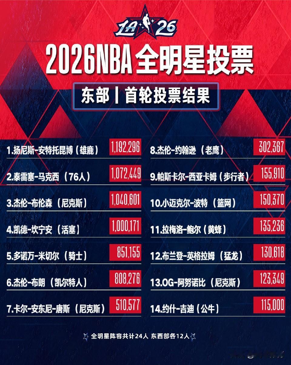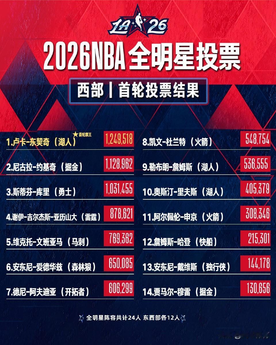 东契奇获得2026NBA全明星首轮票王! 北京时间12月30日,NBA官方公布2026年全明星投票的首轮球迷投票结果,其中卢卡-东契奇以1249518票成为首轮票王,而“字母哥”则以1192296票领跑东部。杜兰特以548754票位居西部第八,勒布朗詹姆斯首轮仅获得536555票,位居西部第九。 东部前五名分别是: 东契奇、约基奇、库里、亚历山大和文班亚马 西部前五名分别是: 字母哥、马克西、布伦森、坎宁安和米切尔 值得一提的是,本届全明星取消了东西部分区,组建两支美国本土球员队和一支国际球员队(世界队),每队至少8人。比赛采用三队循环赛制(共4场,每场12分钟),战绩最佳两队晋级决赛,冠军奖金池180万美元(冠军队每人12.5万美元)。 东契奇 字母哥