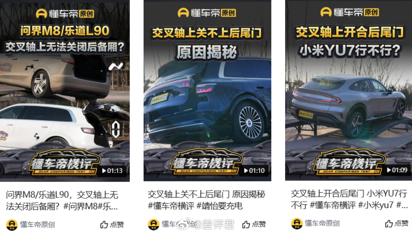 #新能源SUV交叉轴测试#前两天懂车帝把现在很火的几台新能源SUV都开到了交叉轴上,然后在车身静止的状态下看它们的车门或者后备厢能不能正常关闭。结果是问界M8后备厢关不上,特斯拉Model X车门合不拢,小米YU7 、蔚来ES8和乐道L90则都能正常关闭。这直接让这个规模不算大的测试大大滴出圈了一波。关不上门的自然是“无良车企”了,也有不少人出来说“少见多怪”。其实交叉轴测试在燃油车时代就已经风靡汽车媒体圈,但这个测试为什么一直仅存在于民间呢?因为它本来就不严谨,如果换一个交叉轴设施,不同的高度,不同的定点间隔,结果就会完全不同。就比如同样是SUV,像是拥有大梁、上下车身只有软连接的非承载式车身,形变就会比承载式车身要小,甚至几乎都没有形变,因为形变都被大梁承担了。不同轴距的车型,在同一套交叉轴上的几何形变角度和力学矩臂效应也并不相同,长轴距的车型因为车头和车尾之间的 “杠杆” 更长,就更容易让车身中段因为剪切力和扭转应力发生形变。另外,不同的重心高度、不同的门环大小和车门材料,甚至是不同密封条的选型也都会影响车身形变的幅度。再加上不同车型车门的锁止,要求的锁止机构偏移框量、防夹功能的触发阈值也不太一样。那对于大伙关心的车身刚性,应该关注哪个指标呢——车身抗扭刚度(或者叫扭转刚度)。它是个定量的数据,测试是在严格的变量控制下进行的。而一台车的安全性是高是低,需要一套更复杂、更严谨的测试体系才能评判。有意思的是,当年丰田RAV4荣放就因为交叉轴测试被喷了,但它却在中保研的测试里头获得了全G的好成绩。所以说白了,作为一个从油车时代就存在的测试项目,交叉轴关门相比于其他成体系的严谨测试,一直就是个看个乐的民间测试。何必因为这个吵架呢#差评说车#