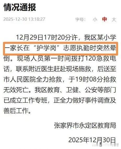 湖南张家界,小学生家长站“护学岗”时死亡,官方通报来了:已成立工作专班,正全力做好事件调查及善后工作。 对于情况通报,网友表示:都是被自愿!双职工还得请假,谈何自愿? 据我所知,不少学校家长护勤的事还真是没有自愿一说,身边同事也有轮流去当校园护工的,都是被安排!实在没人报名,老师就按照学号排班,排到了就群里艾特你!当然这些事情班主任不会亲自办,都是所谓的“家委”艾特的居多吧。 个人认为,为什么学校要家长轮流去“护学岗”呢?难道是觉得家长没事做都是游手好闲么?作为很多收费性质的教育机构,学校的保安干嘛去了?如果不够,不能多招几个校园专职保安护岗么?现在所谓的家校共育把不少家长是折腾狠了。想当年我们自己上学的时候,家长可没这么多事儿。这下家长为了护学岗丢了命,虽然可能是自身身体原因,但遇到这样的事情他的孩子和家人得有多伤悲啊?! 屏幕前的“你们”学校也有被安排去当护工的吗?想必很多人的答案一定是“Yes”。那么这样的现象该如何化解?大家怎么看?有好的建议吗?评论区聊聊吧。