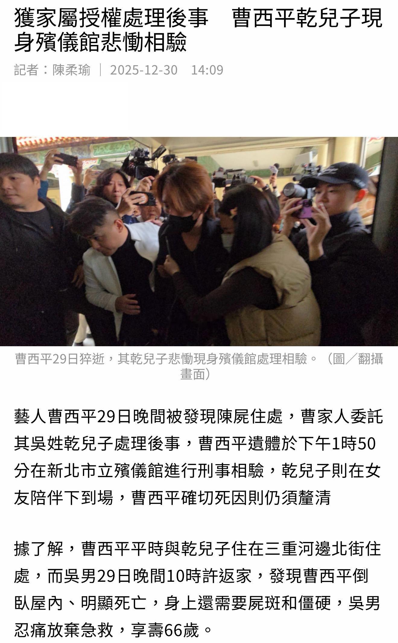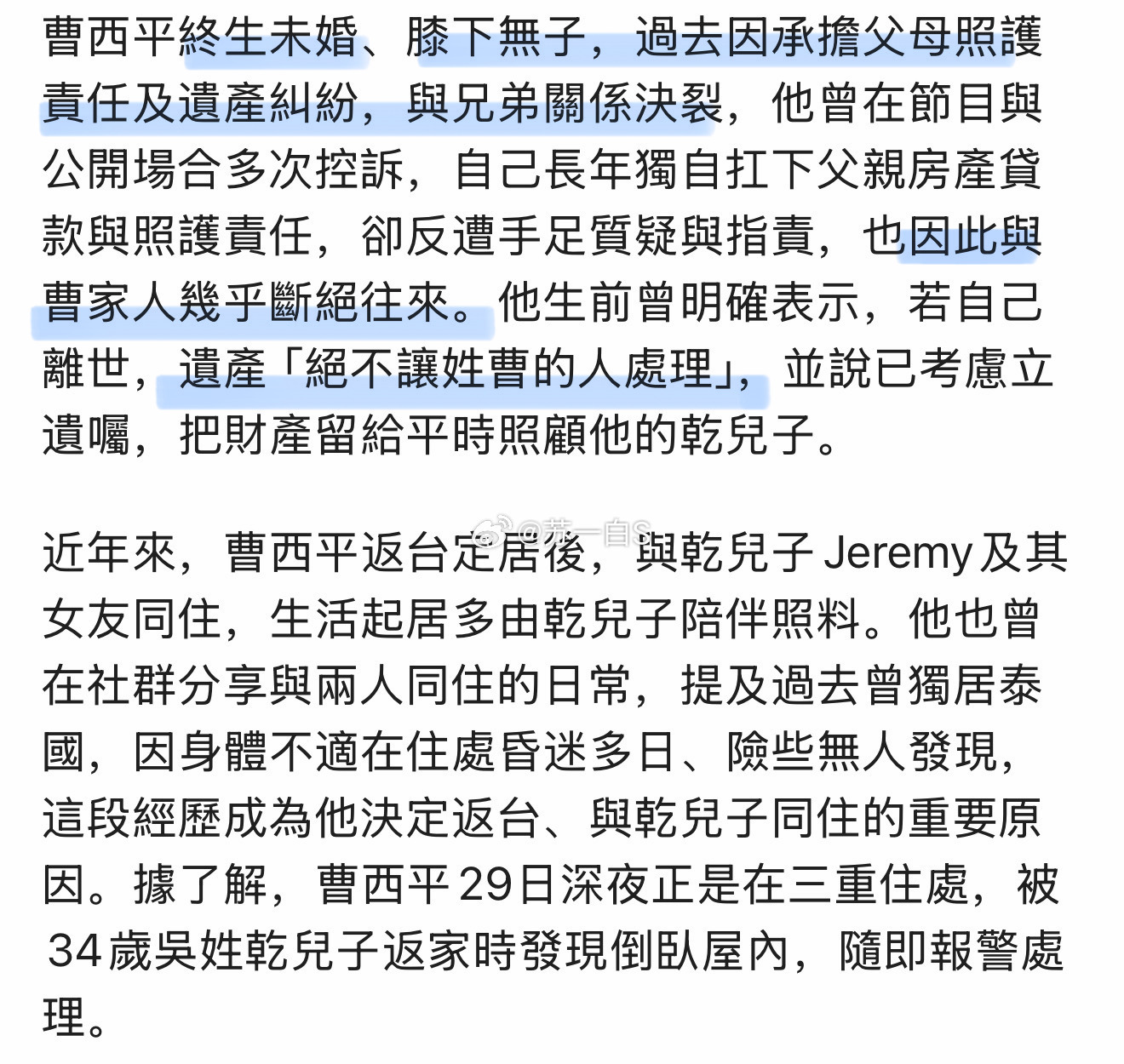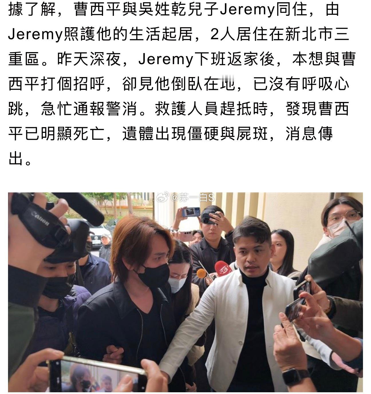曹西平大哥生前已与自家兄弟断联决裂,他曾明确表示“遗产绝不让姓曹的人处理”。现在他离世,曹姓家属似乎不愿接手处理后事,因而警方和相关业者无法完成行政相验工作,一直照顾他生活起居的“干儿子”Jeremy在社交平台喊话曹家人,让他们把处理后事的工作交给自己👇