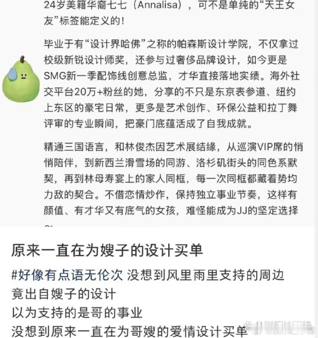曝林俊杰卖的粉丝周边是七七设计的据网友爆料称,林俊杰女友七七自2025年起担任林俊杰个人潮牌SMG新一季配饰线创意总监,主导设计了包括巡演荧光手环、项链、徽章等粉丝周边产品,部分单品因设计简约高级而热销。