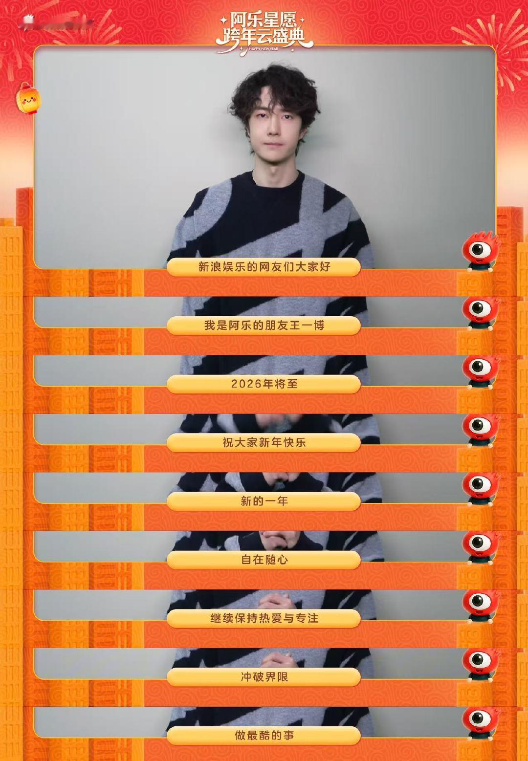 来自王一博的2026新年祝福2026和王一博一起做最酷的事 来【阿乐星愿跨年云盛典】,与阿乐的星朋友相约2026,一博寄语:“新的一年自在随心,继续保持热爱与专注,冲破界限,做最酷的事!”今年《探索新境》里一博探险的样子真的超酷,期待电影《人·鱼》带我们领略一博更酷的另一面!