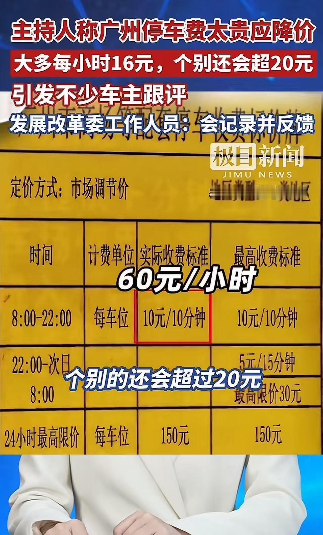 主持人发声指责广州停车费贵得离谱,强烈呼吁降价!这一言论瞬间在网络上掀起了轩然大波,引发了众多车主的强烈共鸣! 这名主持人说:“以广州的核心商圈为例,那停车费简直高得让人咋舌。想要找到收费低于每小时15元的停车位,那简直比登天还难,基本每小时都是16元起步,个别地方的收费甚至还会超过20元,而且有的停车场收费还不封顶,这费用就像坐了火箭一样蹭蹭往上涨。实在承受不起。” 主持人的收入想对较高,他都吃不消,更何况普通老百姓了,所以这事情一经曝光,网友们瞬间炸开了锅,各种吐槽声不绝于耳。 有网友说,说给扎心的故事,我上班一个小时才10元,一天上班10小时100块钱! 也有网友说,也没有半小时免费的说法,进去了就开始算钱,哪怕你进去转一圈出来没有车位! 还有网友说,本来就是市场调节的结果,车位紧张停车费就会高,加上现在用车成本低了,都喜欢开车出去,车就更多了,一般商场都有消费就有停车优惠的,太低的停车费会导致一堆不消费的车主占用很多停车位,真正有需要的停不了,还造成车场入口大塞车。还是那句话,觉得贵就公共交通或者打车。 面对网友们的热烈讨论,记者以网民的身份向广州市发展和改革委员会反映了此事。工作人员表示,会认真记录相关意见和建议,并将其反馈给相关部门。如果以后要调整停车费政策,这些意见会作为重要的参考依据。 在这场关于停车费的争论中,我们看到了不同利益群体的诉求和观点碰撞。然而,无论是车主们对高昂停车费的无奈与不满,还是部分网友对市场调节机制的理解与支持,都不能忽视一个现实问题:城市停车资源的合理配置和科学定价至关重要。 停车费不能一味地高,让车主们不堪重负;也不能一味地低,导致资源浪费和交通拥堵。相关部门应该深入调研,综合考量各种因素,制定出既符合市场规律又能让广大车主接受的合理停车费政策。 否则,这场关于停车费的争论只会无休止地进行下去,而车主们的“停车难”问题也依然得不到根本解决。