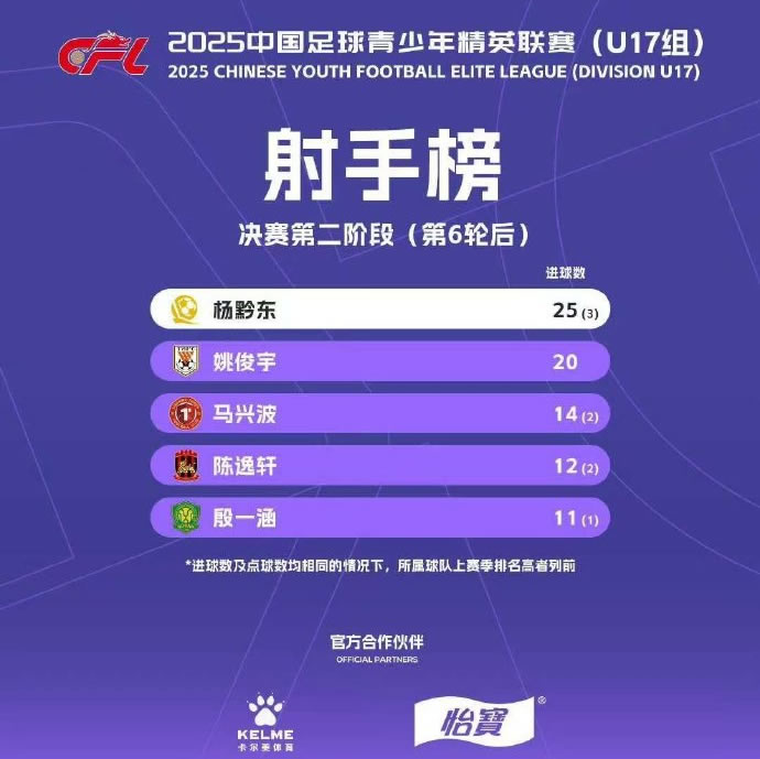 积分榜和射手榜双双第一!恒大足校U17再立新功,提前一轮夺取中青赛U17组冠军。不仅在积分榜上比排名第二的长春亚泰U17多出5分,连射手榜也比排名第二的对手多出5球。