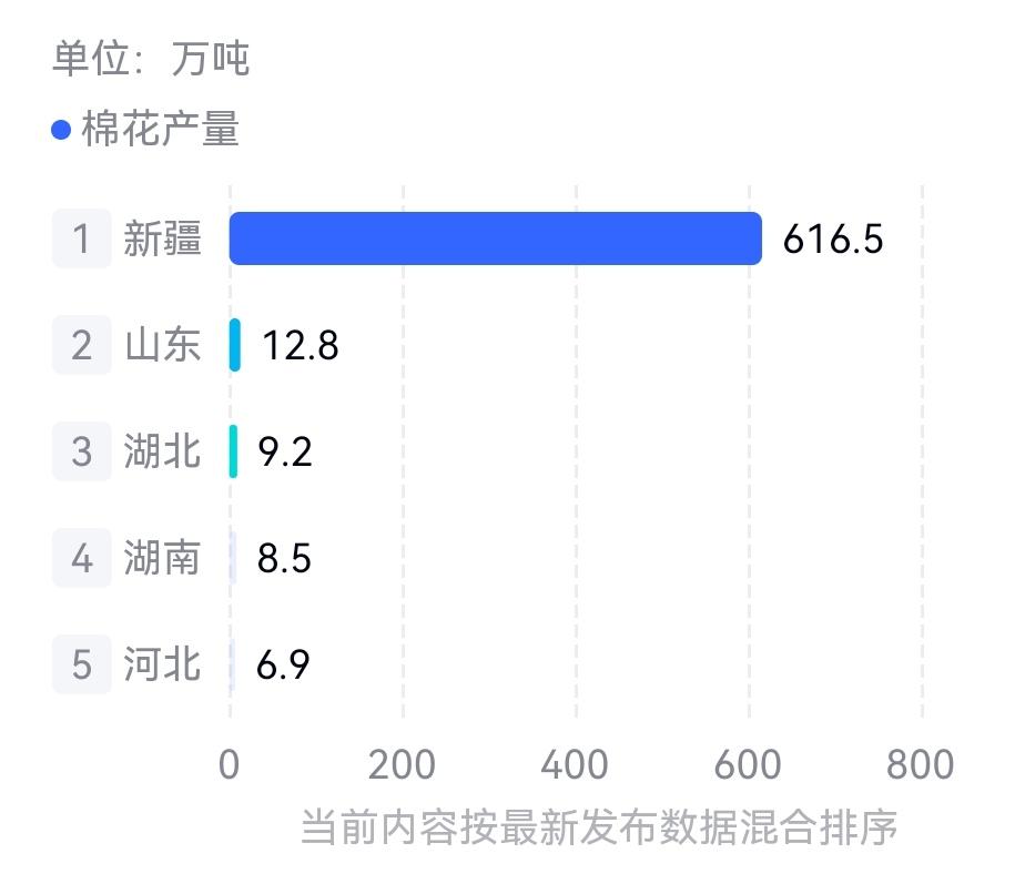全国各省棉花产量,新疆棉花一家独大,年产量已经突破600万吨,棉花那么轻的东西,这个量太恐怖了。全国其他省份几乎可以忽略不计了,全部加起来不到新疆零头的零头。