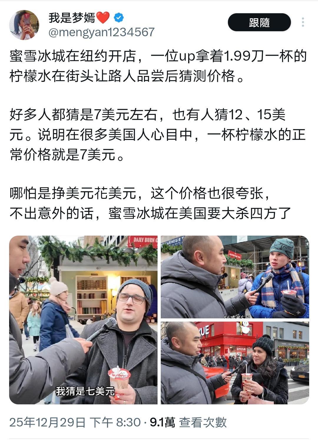 雪王出征,寸草不生! 蜜雪冰城纽约店落户曼哈顿,人潮比起星光大道,只多不少。 几年前去过法拉盛一家黑虎堂黑糖珍珠奶茶,我记得当时价格就已经是7刀了吧,现在应该不止。 我把蜜雪冰城店的信息发给我哥,他说,早知道他们这次就会去的,因为我们还特意去了喜茶,价格是7.99刀。 照这价格,雪王统治大米利坚是迟早的事! Source: X