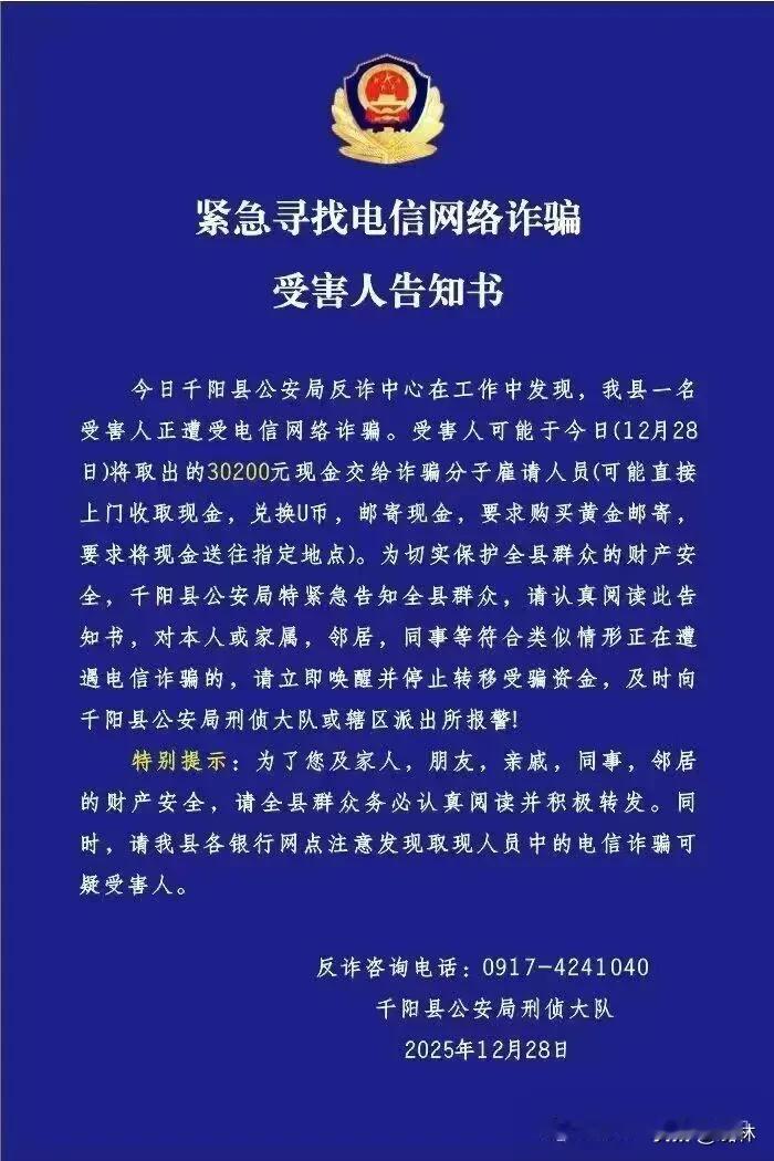 宝鸡警方紧急寻人 12月28日,千阳县公安局刑侦大队发布《紧急寻找电信网络诈骗受害人告知书》,内容如下。