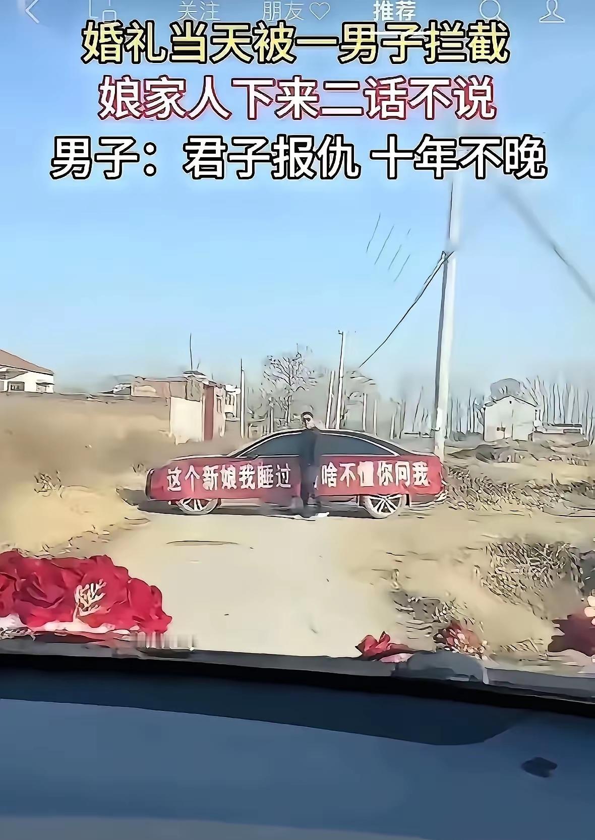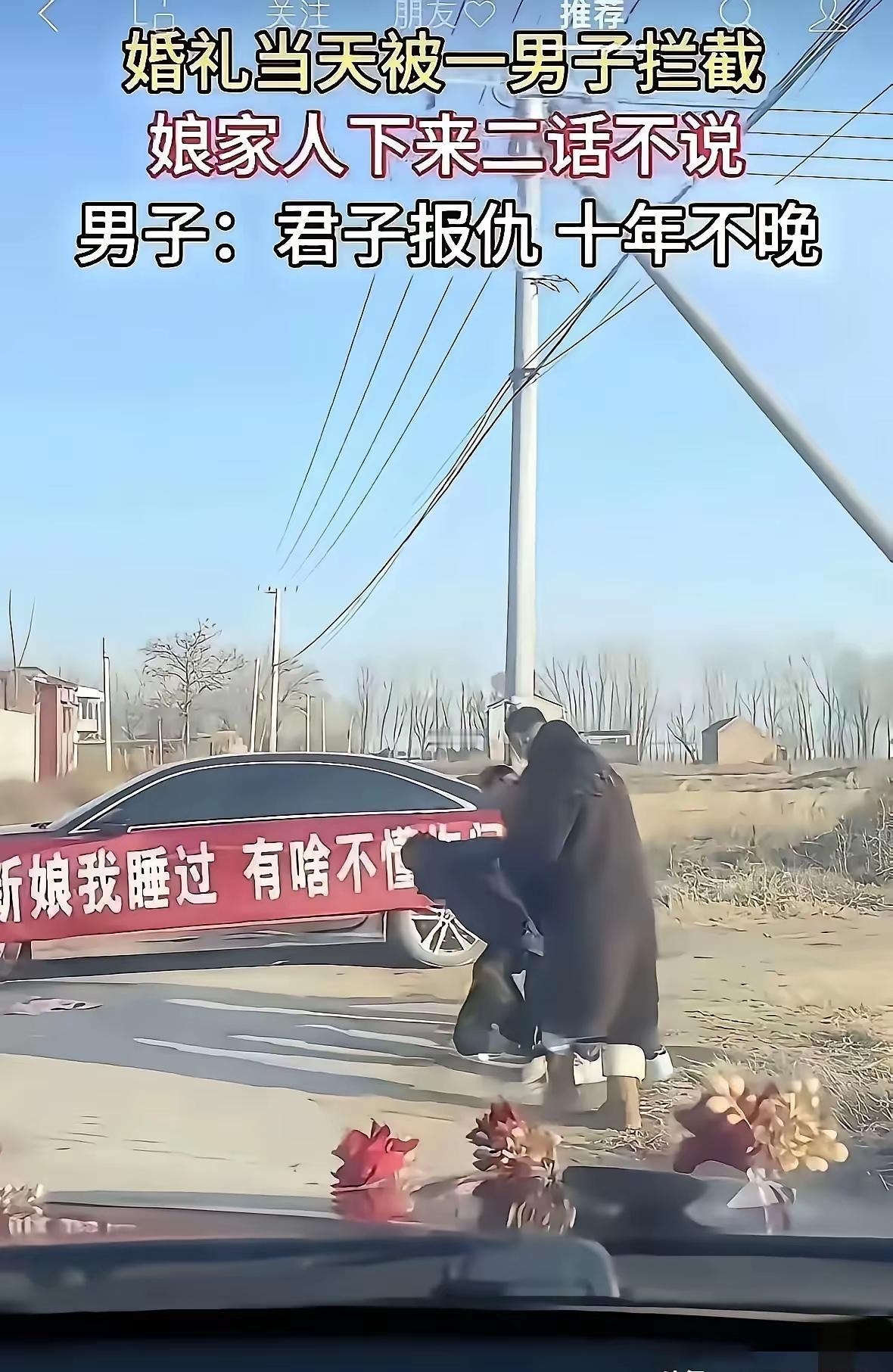 男子这是自找不痛快 谈了三年的女友,就因为彩礼没谈拢,转头嫁给别人,这哥们儿心里咽不下这口气,直接在婚礼当天搞事情! 他开车拦在婚车前,还扯着横幅闹,非得把场面搅得鸡飞狗跳。新娘娘家人哪能忍?下车二话不说就把他按倒拖走,婚期吉时耽误不起! 最尬的还是新郎,脸黑得跟锅底似的,站在原地一脸懵,怕是做梦都没想到新婚当天能遇上这出。这男的真是拎不清,彩礼谈不拢是缘分尽了,好聚好散不行吗?非得撕破脸,最后丢的是自己的人。 他这一闹,不仅毁了别人的婚礼,自己也成了笑话。 换作是你,遇到彩礼谈崩的情况,会选择体面退场还是死缠烂打?