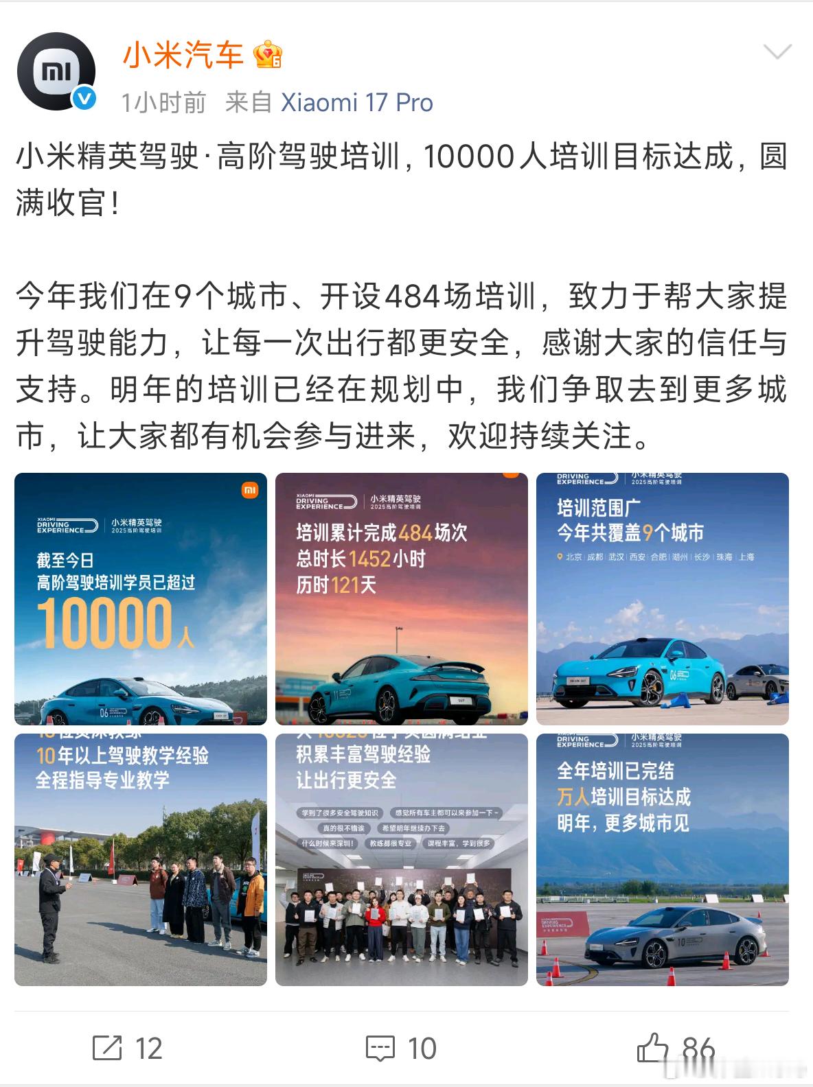小米高阶驾驶培训1万人目标达成听去过的聊过,小米的这个高阶驾驶培训非常专业,项目包含加速制动、绕桩、湿滑路面和金卡纳训练等,既能让你了解到车的性能边界、掌握安全驾驶技能,又能让你感受到极限驾驶的乐趣。最关键首批10000人还是免费的,小米自掏腰包给用户谋福利,实打实在用户安全上投入,从这里就能看出一个车企的社会责任感了。这1万人掌握了车辆性能边界,也学会了紧急避险技巧,然后再教给周边人,会有更多人从中受益,从而让出行更安全。我今年本来也想报名参加小米高阶驾驶培训,可惜时间和地点都不太合适,看看明年有没有机会吧。