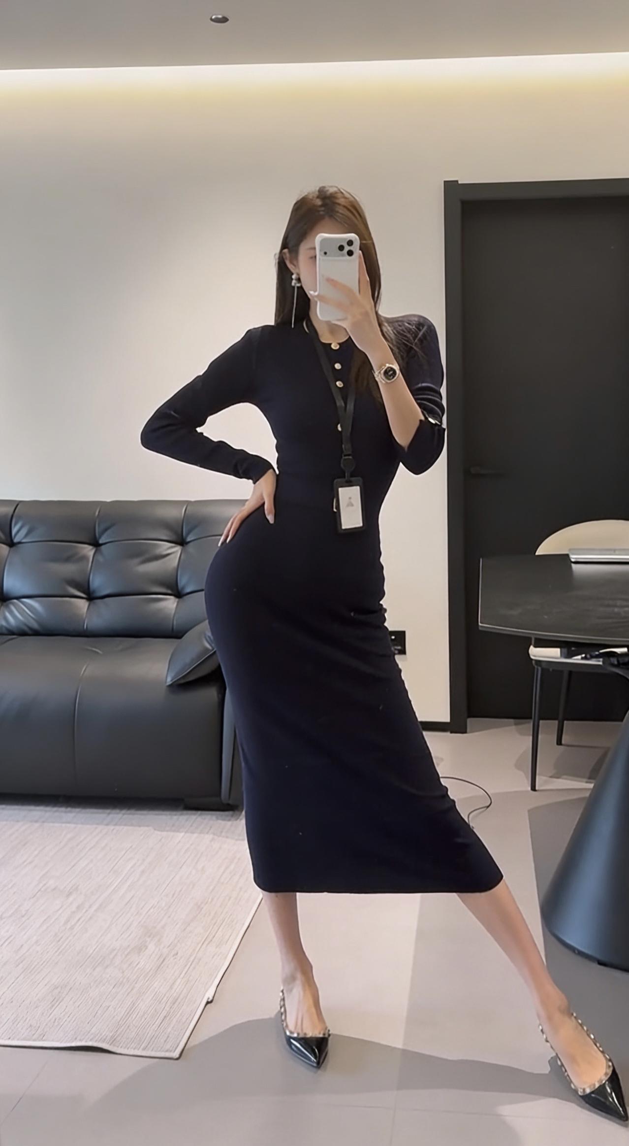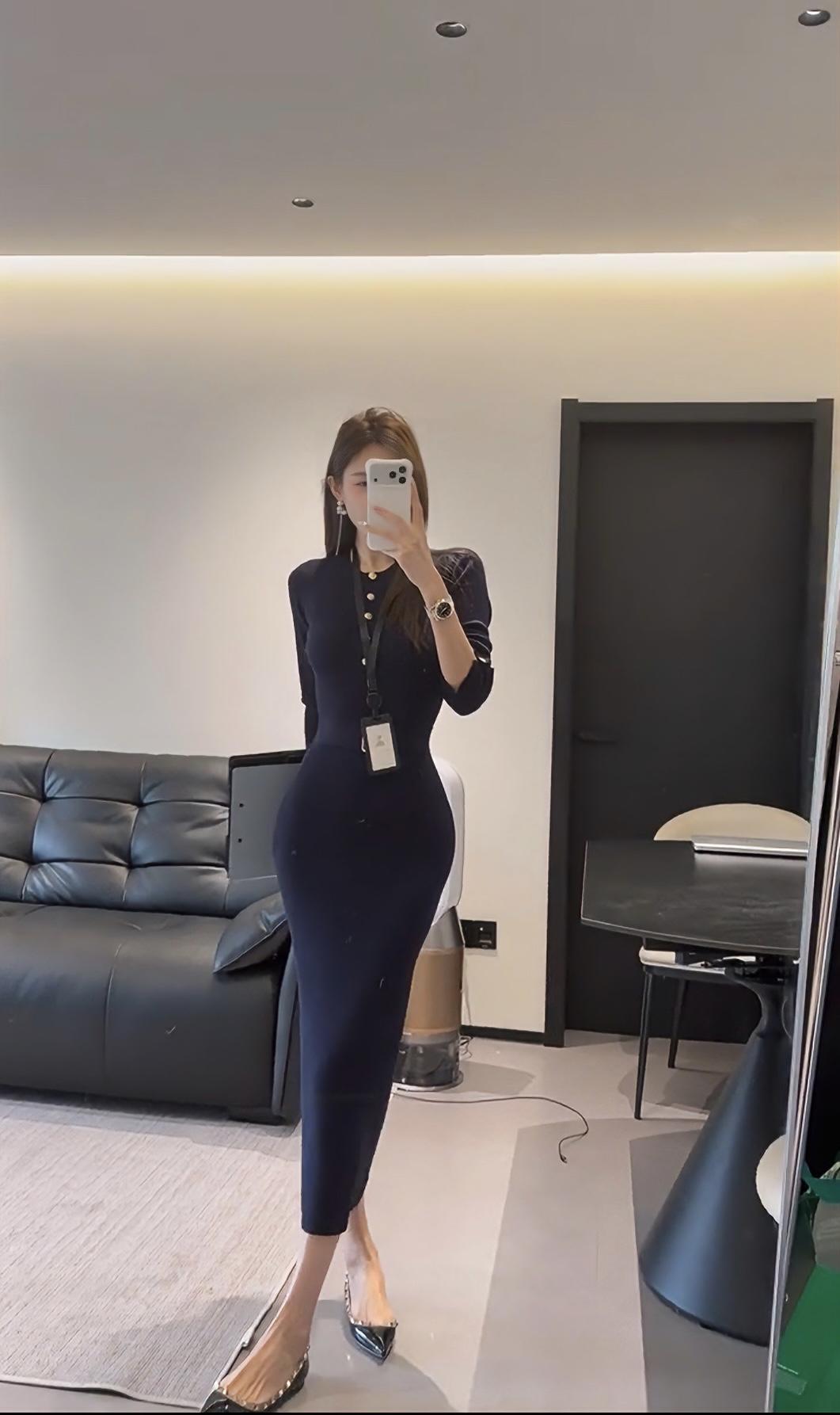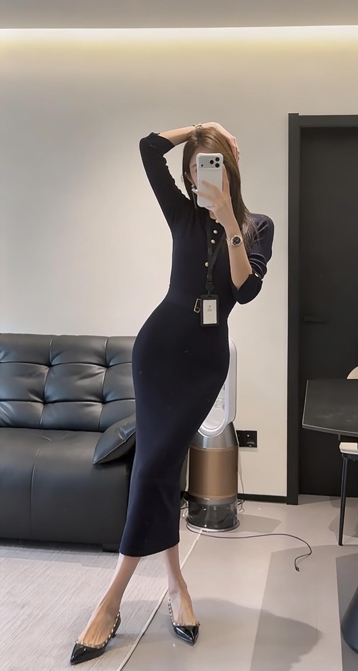 这台穿搭的核心是藏蓝色修身针织连衣裙,属于包臀修身的中长款款式,领口处有金属纽扣点缀,搭配黑色尖头皮鞋,风格兼具职场精致感与女性曲线美。 连衣裙:针织面料柔软且有弹性,修身剪裁能勾勒身形,藏蓝色属于低饱和的高级色,正式又不沉闷;金属纽扣作为细节装饰,提升了精致度。 搭配不同的外套可以适合各好场合: 1. 商务轻职场场景:如创意类公司日常办公、商务洽谈、小型工作会议,藏蓝色的正式感适配职场,修身设计又不会过于刻板。 2. 半正式社交场合:如行业交流酒会、轻奢品牌品鉴会、商务晚宴等,连衣裙的质感和剪裁能hold住场合氛围,又不会像正装礼服那样夸张。 3. 精致日常/轻社交:如高端下午茶、闺蜜小聚、轻奢探店等,兼顾了美观与舒适度,展现优雅气质。