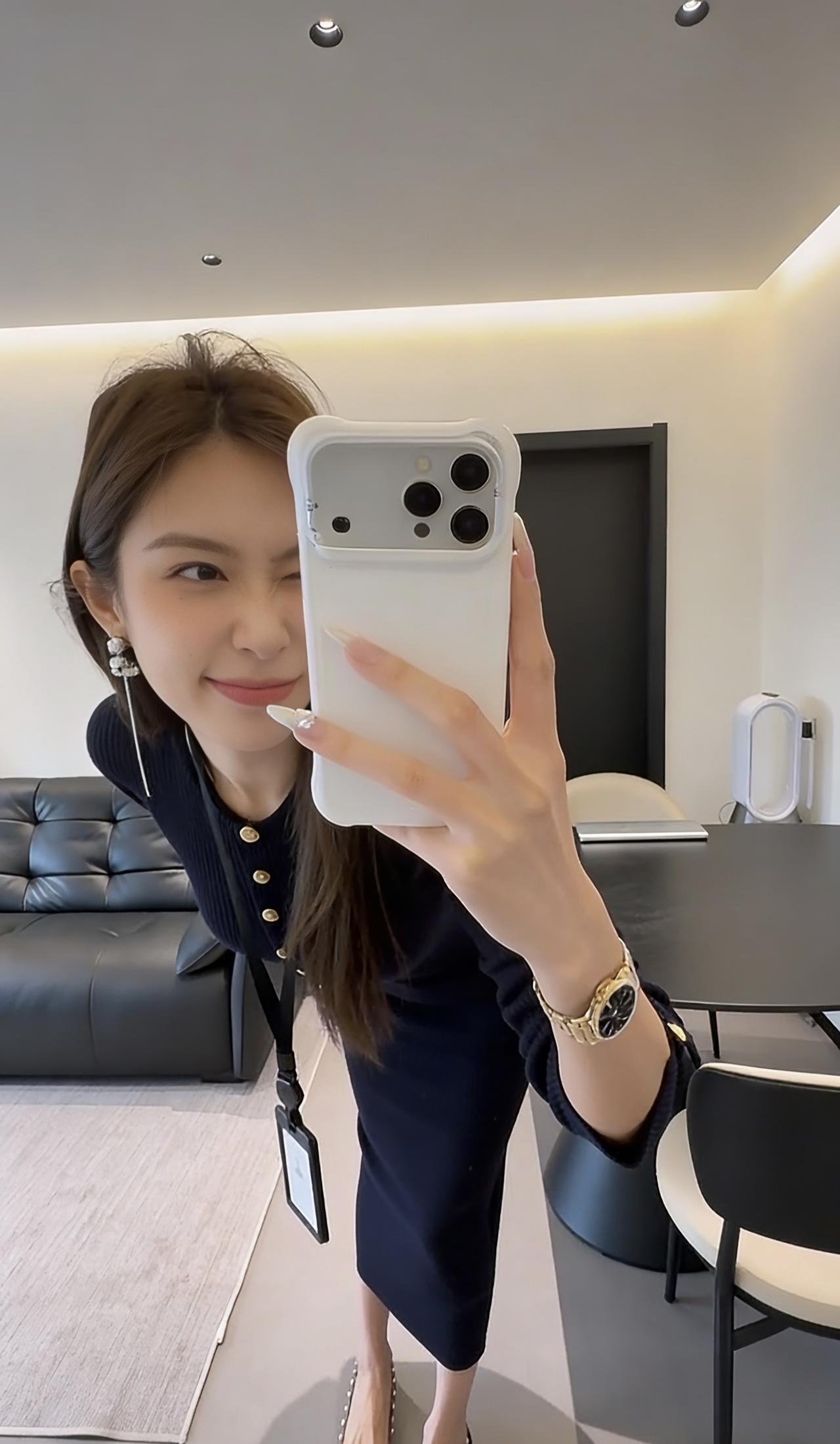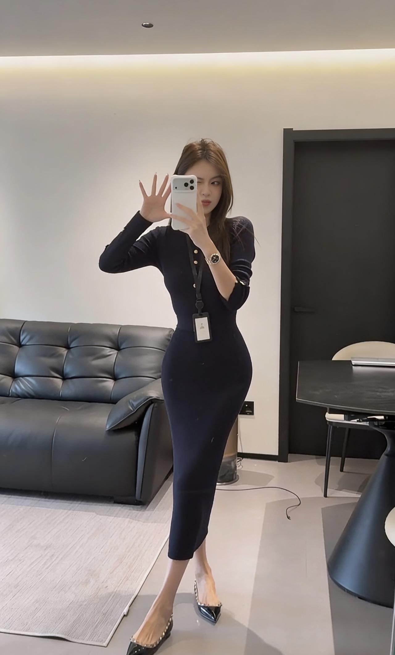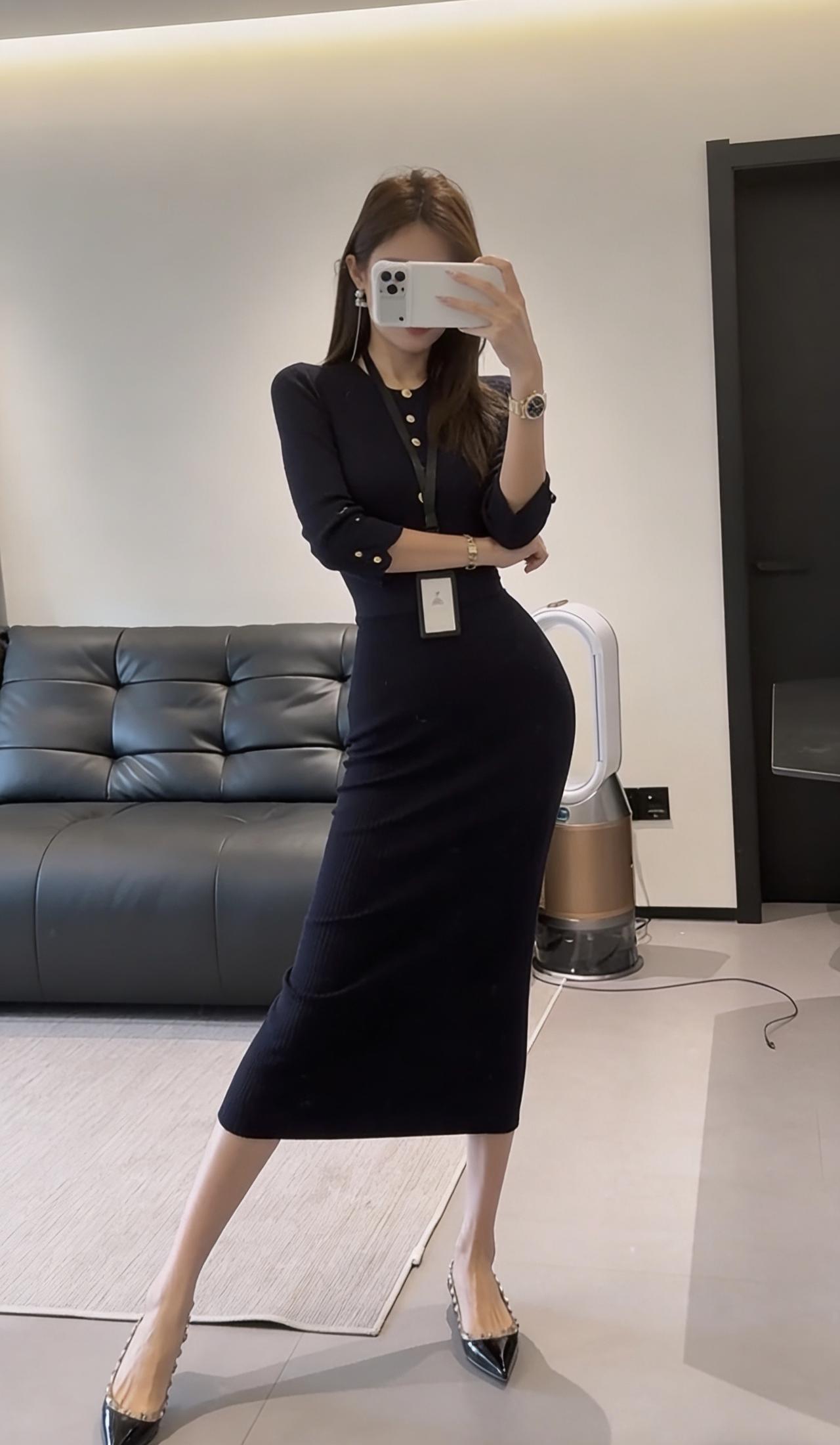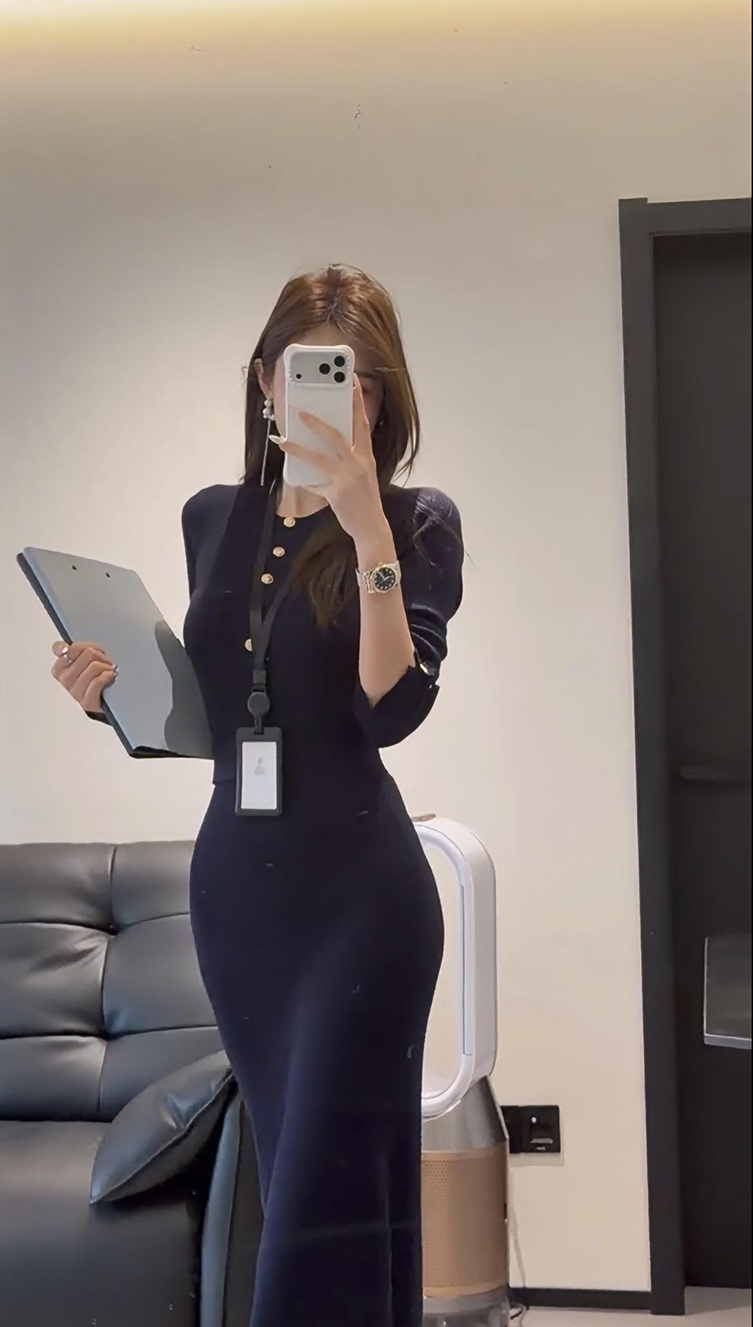 这台穿搭的核心是藏蓝色修身针织连衣裙,属于包臀修身的中长款款式,领口处有金属纽扣点缀,搭配黑色尖头皮鞋,风格兼具职场精致感与女性曲线美。 连衣裙:针织面料柔软且有弹性,修身剪裁能勾勒身形,藏蓝色属于低饱和的高级色,正式又不沉闷;金属纽扣作为细节装饰,提升了精致度。 搭配不同的外套可以适合各好场合: 1. 商务轻职场场景:如创意类公司日常办公、商务洽谈、小型工作会议,藏蓝色的正式感适配职场,修身设计又不会过于刻板。 2. 半正式社交场合:如行业交流酒会、轻奢品牌品鉴会、商务晚宴等,连衣裙的质感和剪裁能hold住场合氛围,又不会像正装礼服那样夸张。 3. 精致日常/轻社交:如高端下午茶、闺蜜小聚、轻奢探店等,兼顾了美观与舒适度,展现优雅气质。