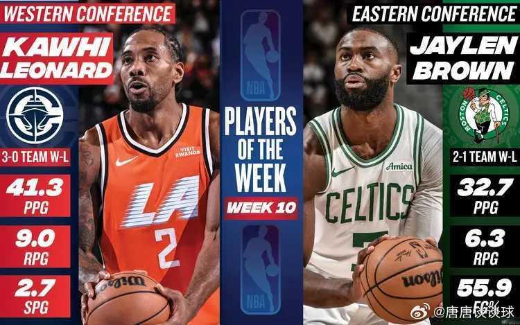 12月30日NBA官方公布上周东西部最佳球员,凯尔特人前锋杰伦-布朗和快船前锋科怀-伦纳德当选。上周,布朗场均得到32.7分6.3篮板,投篮命中率高达55.9%,带领凯尔特人取得了2胜1负的战绩;伦纳德上周场均得到41.3分9篮板2.7抢断,率领快船3战全胜。